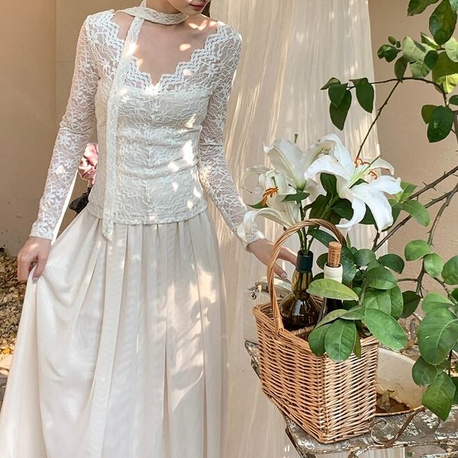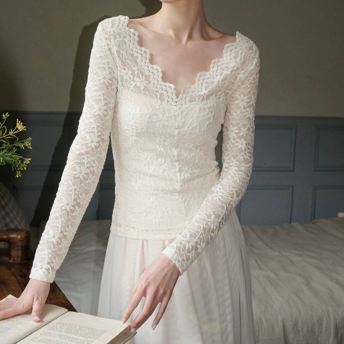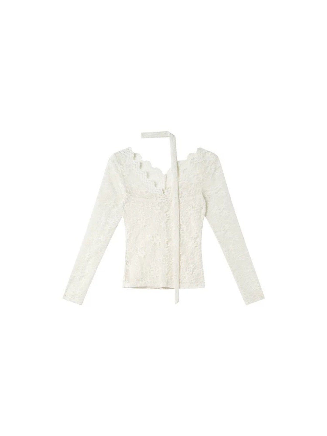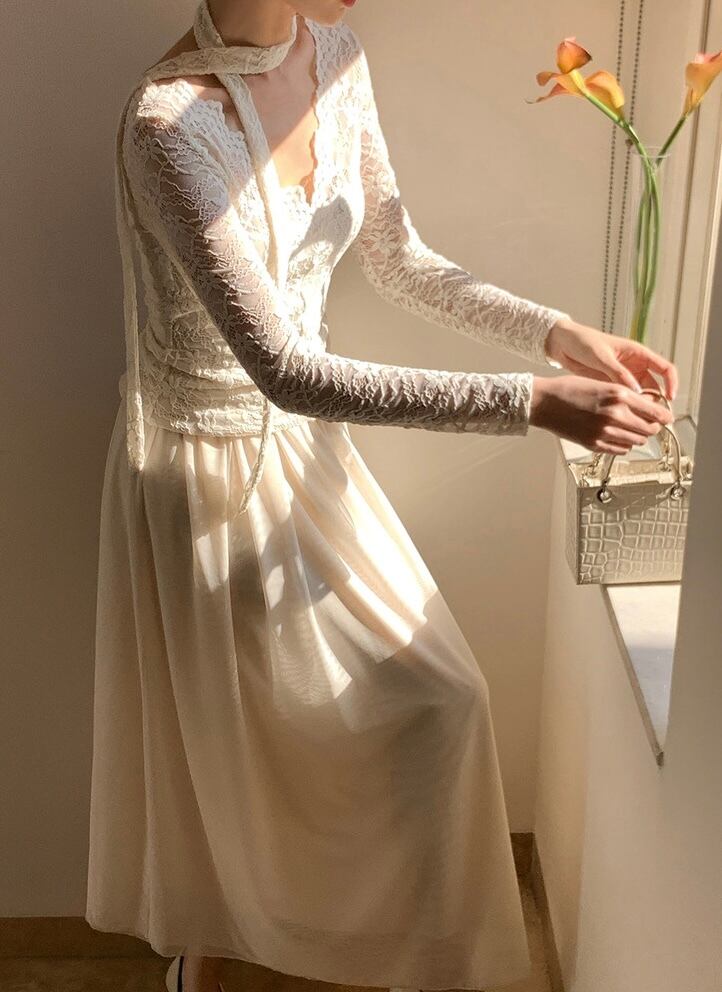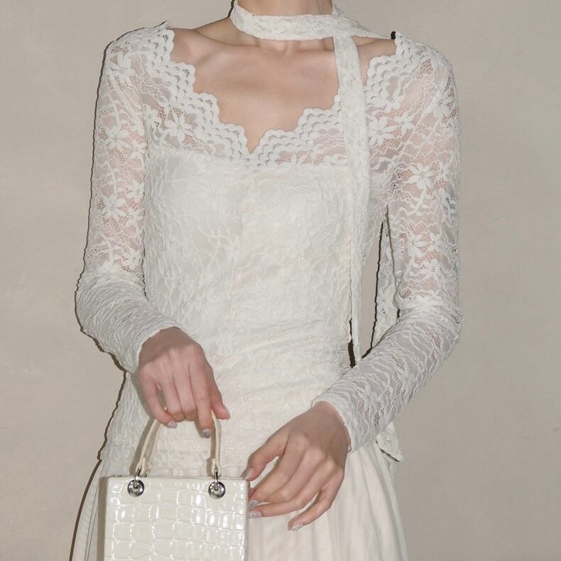 ボウタイ付きレースVネックトップス