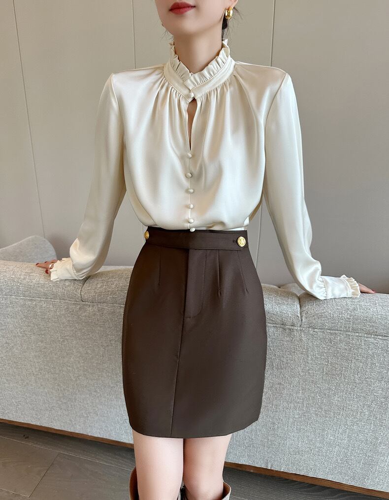 スタンドカラーフリルフレンチブラウス