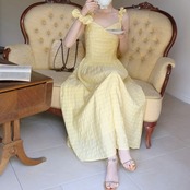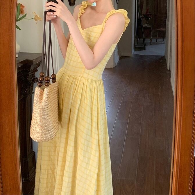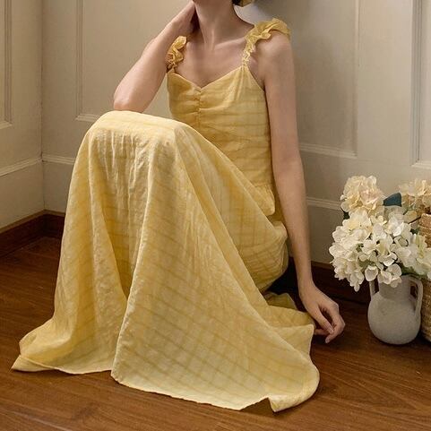 イエローチェックフレアロングワンピース