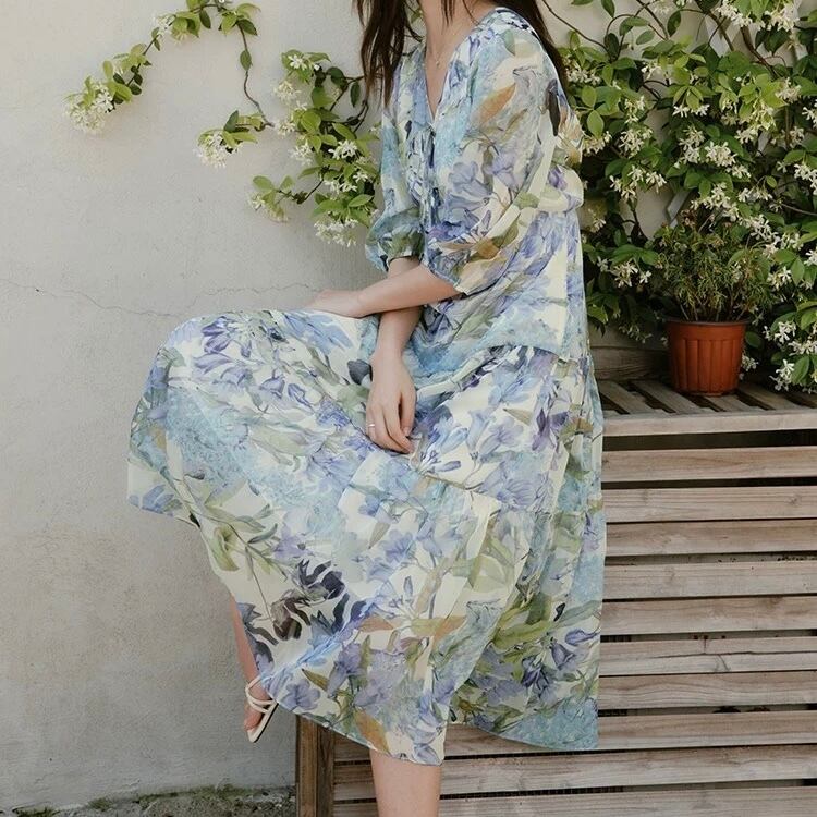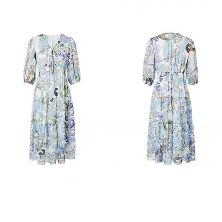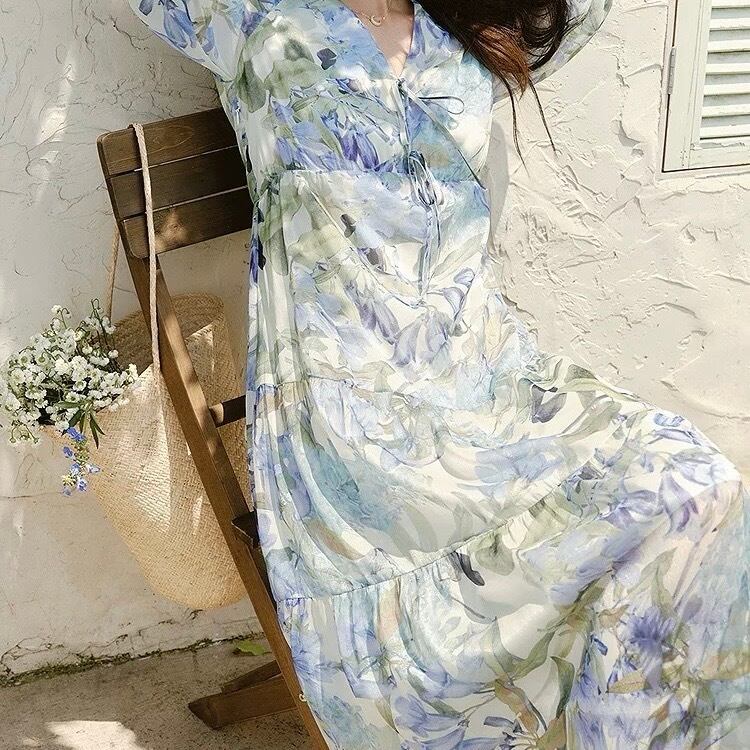 【S/Mのみ】ブルーフラワーフレアワンピース
