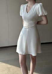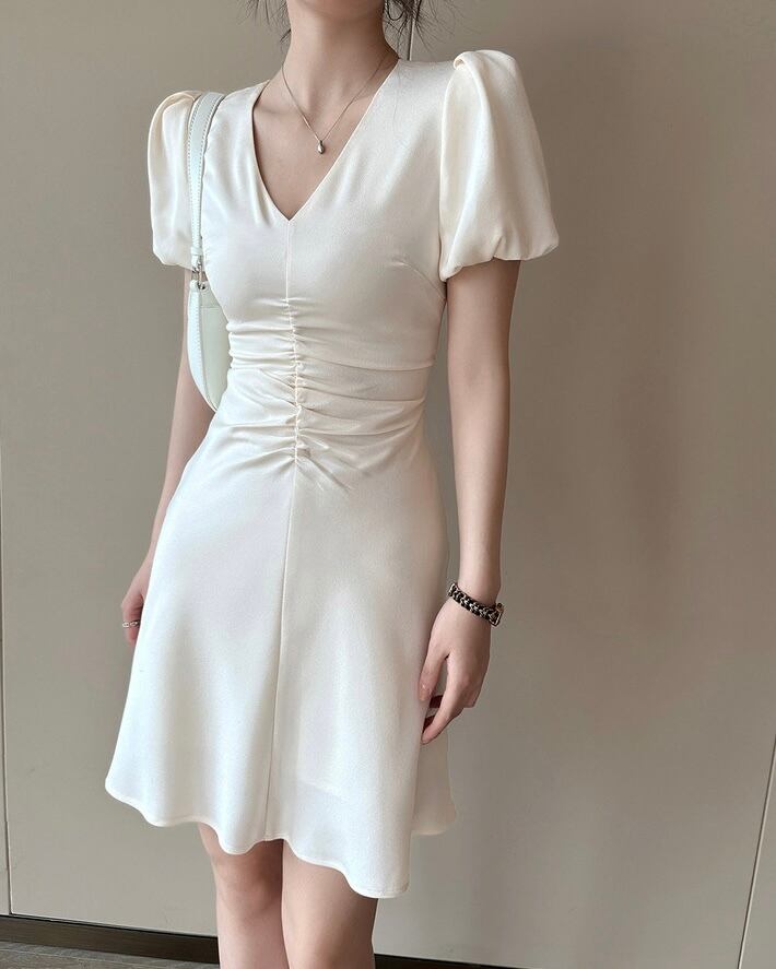 フレンチパフスリーブVネックシャーリングワンピース