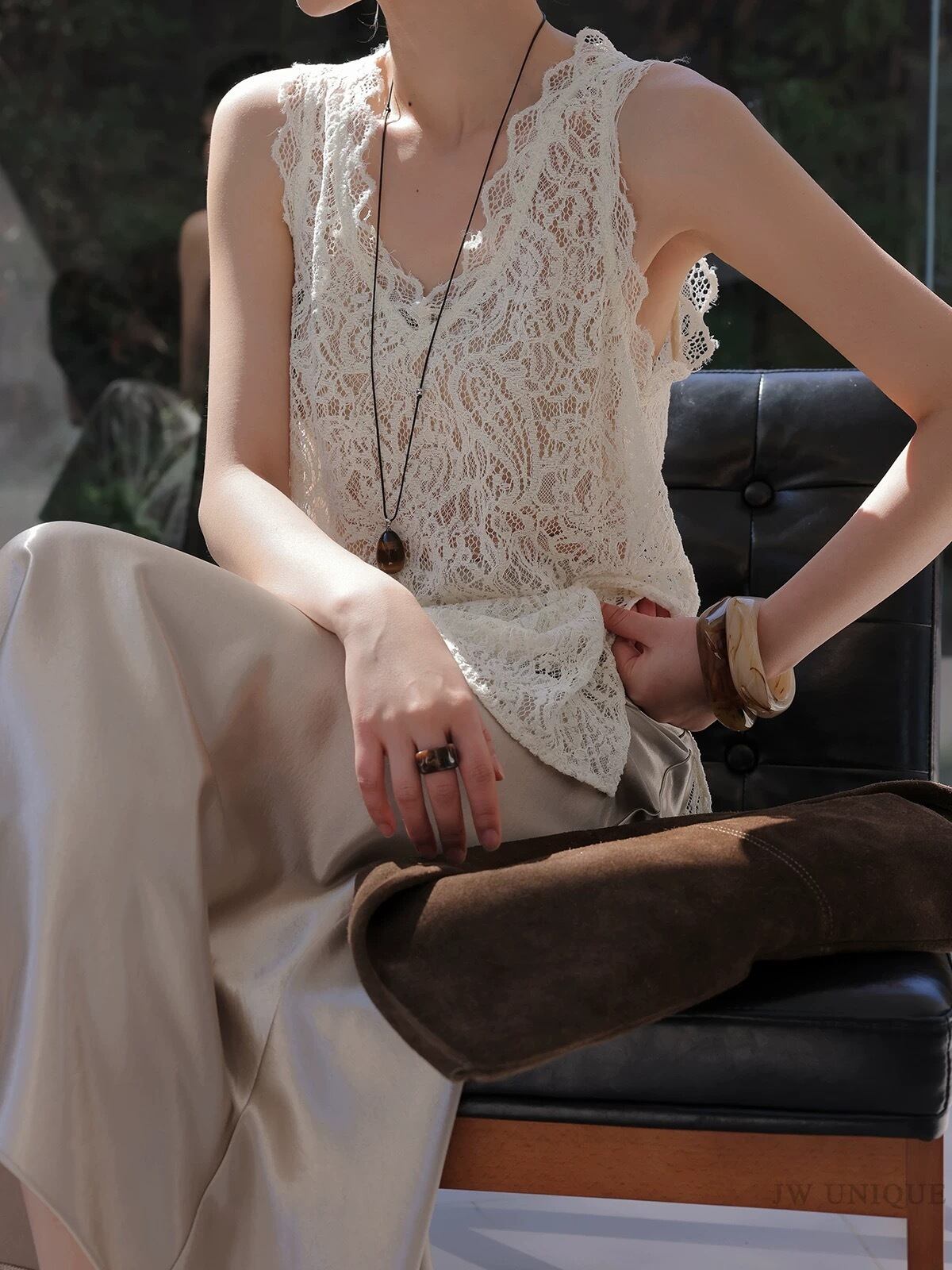 Vネックレースノースリーブトップス