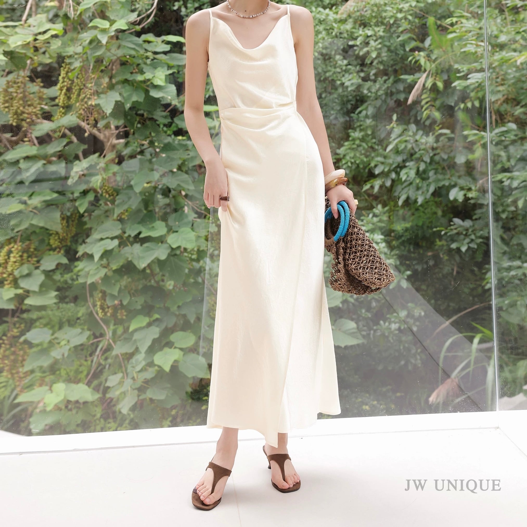 ウエストタックドレープネックサテンワンピース