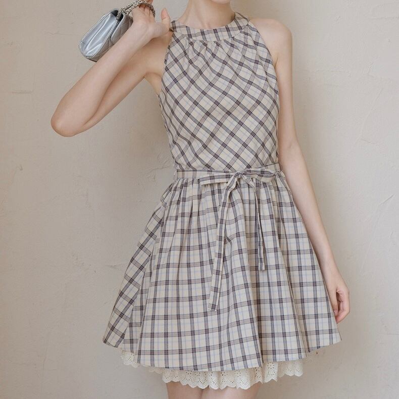ウエストリボンチェックミニワンピース