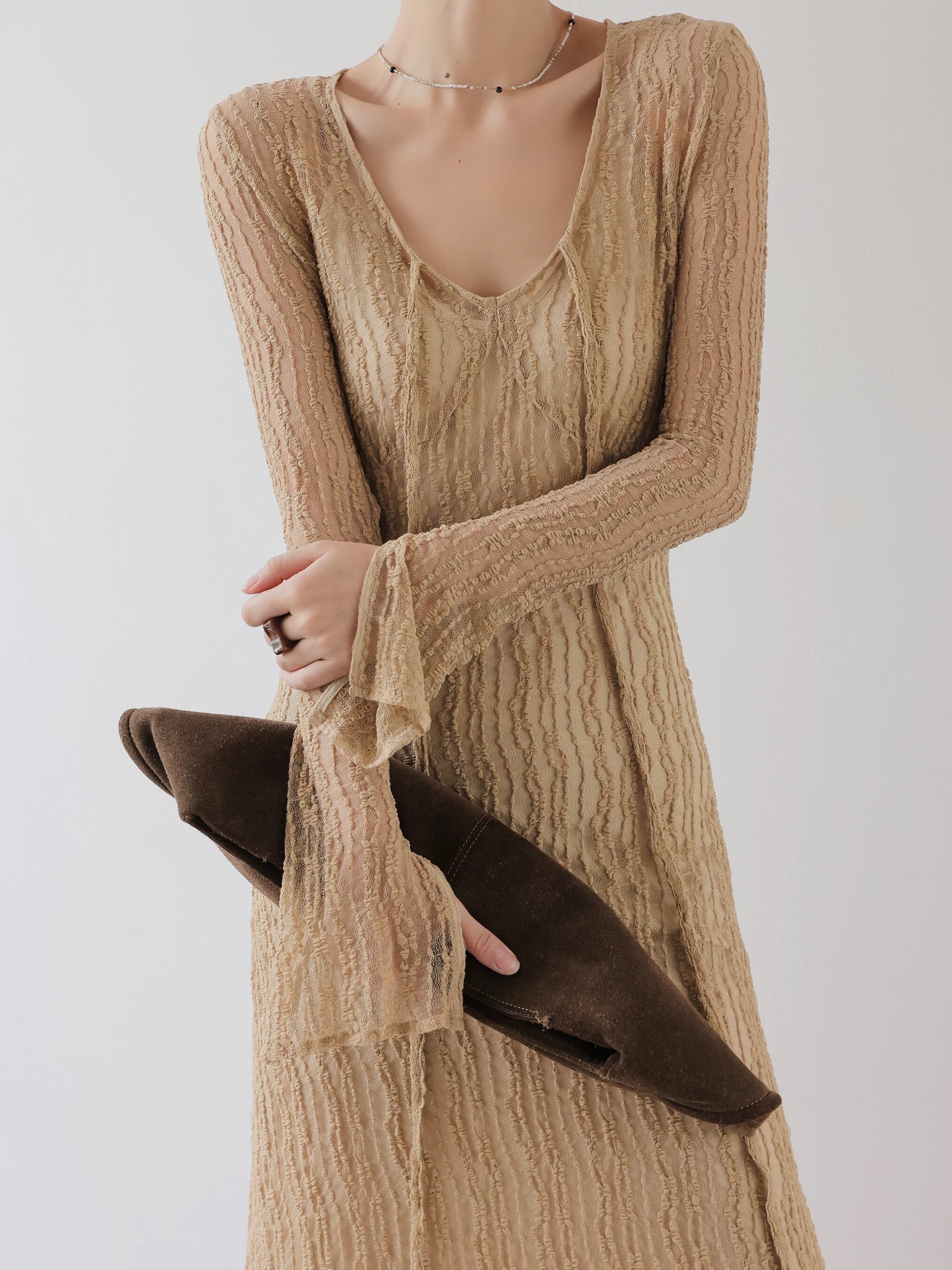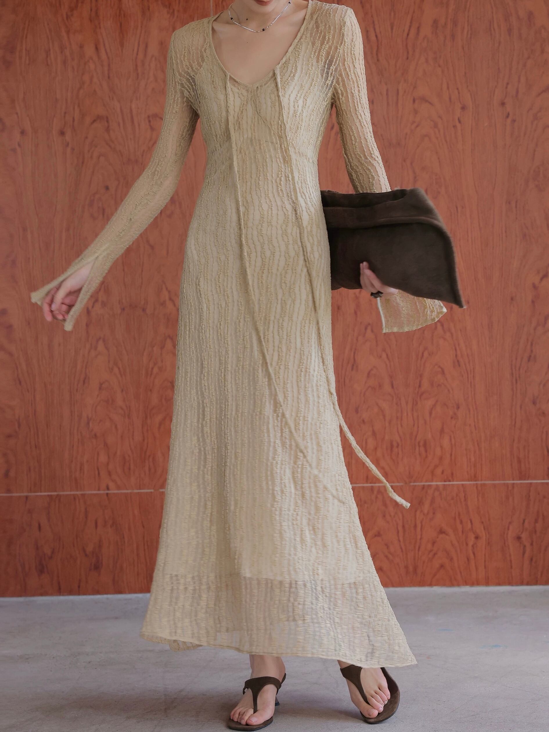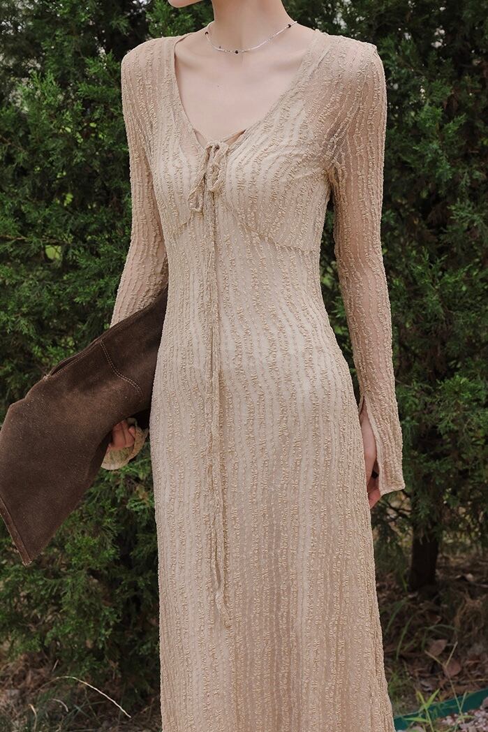 Vネックボウタイレースロングワンピース