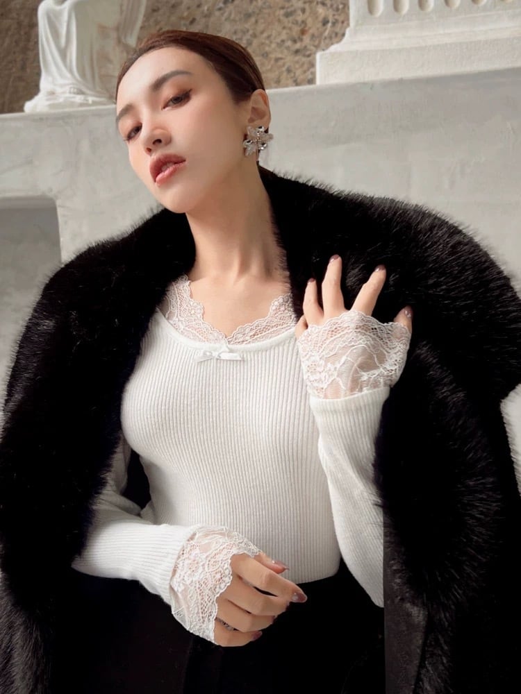 ラウンドネックレースリボンリブニットトップス