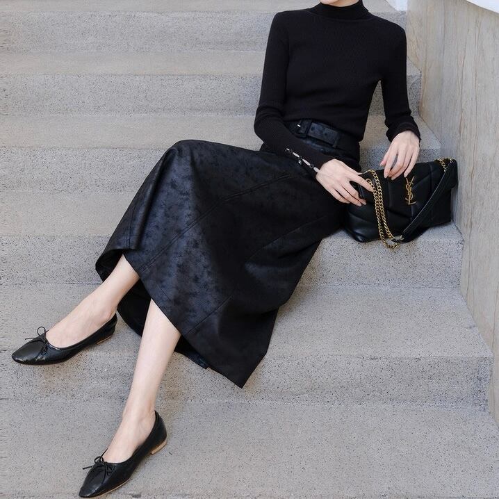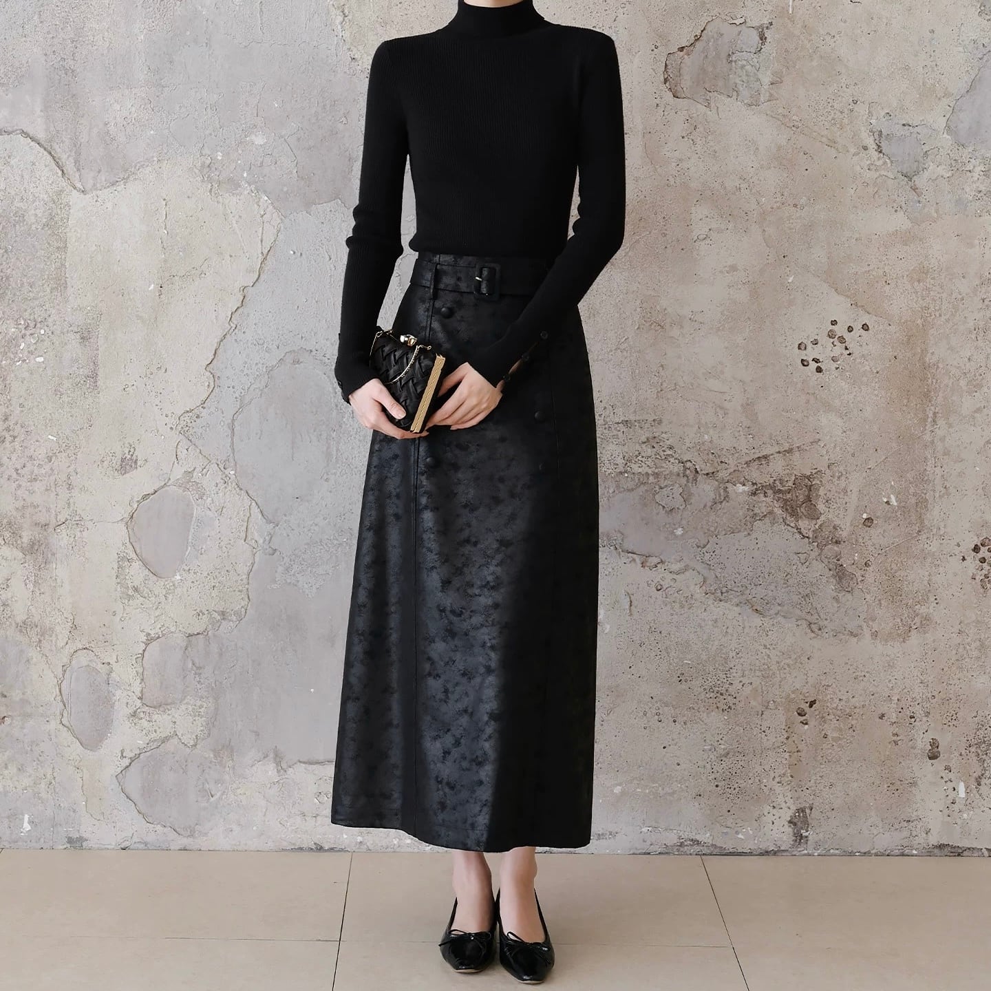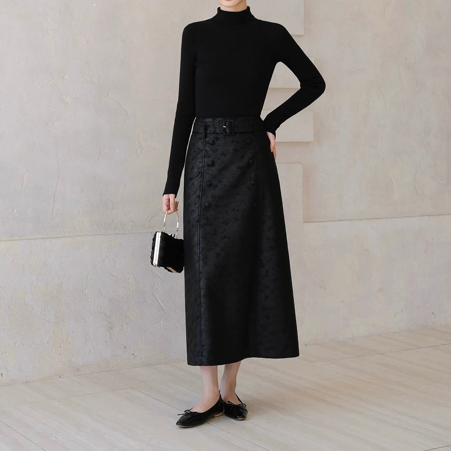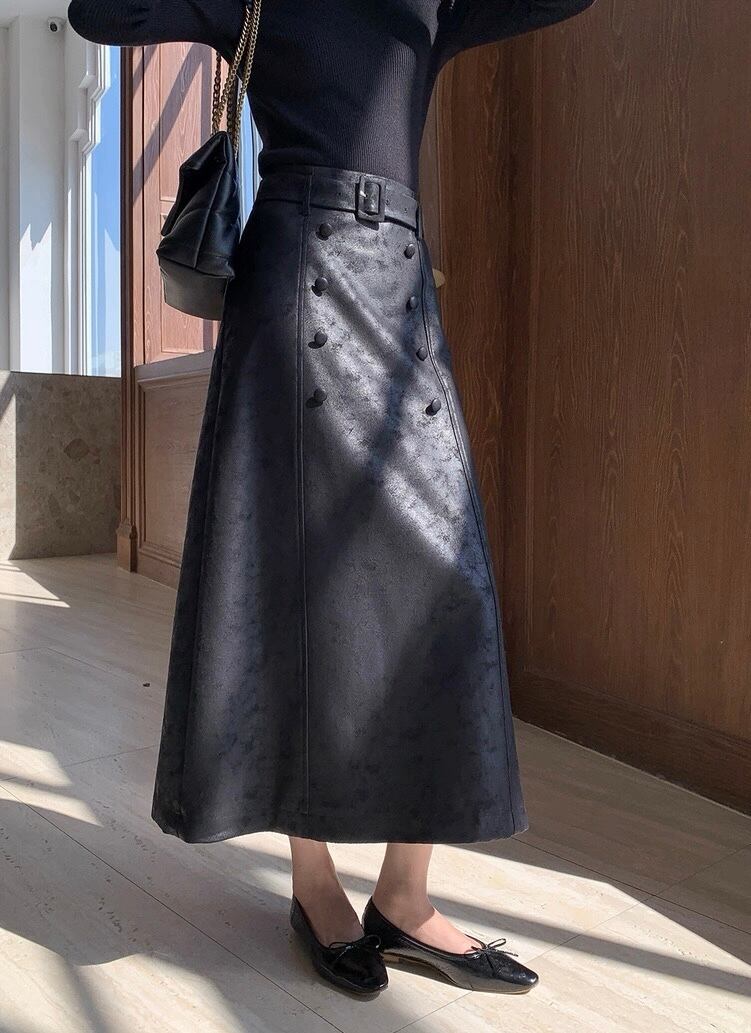 ベルト付きパターンブラックロングスカート