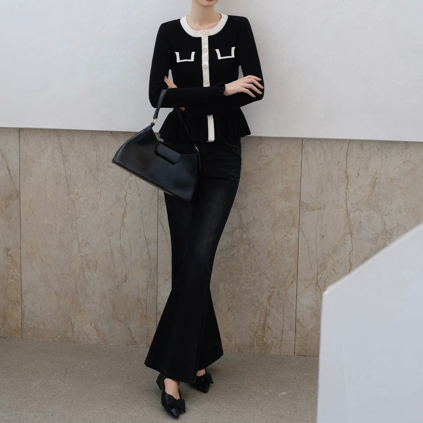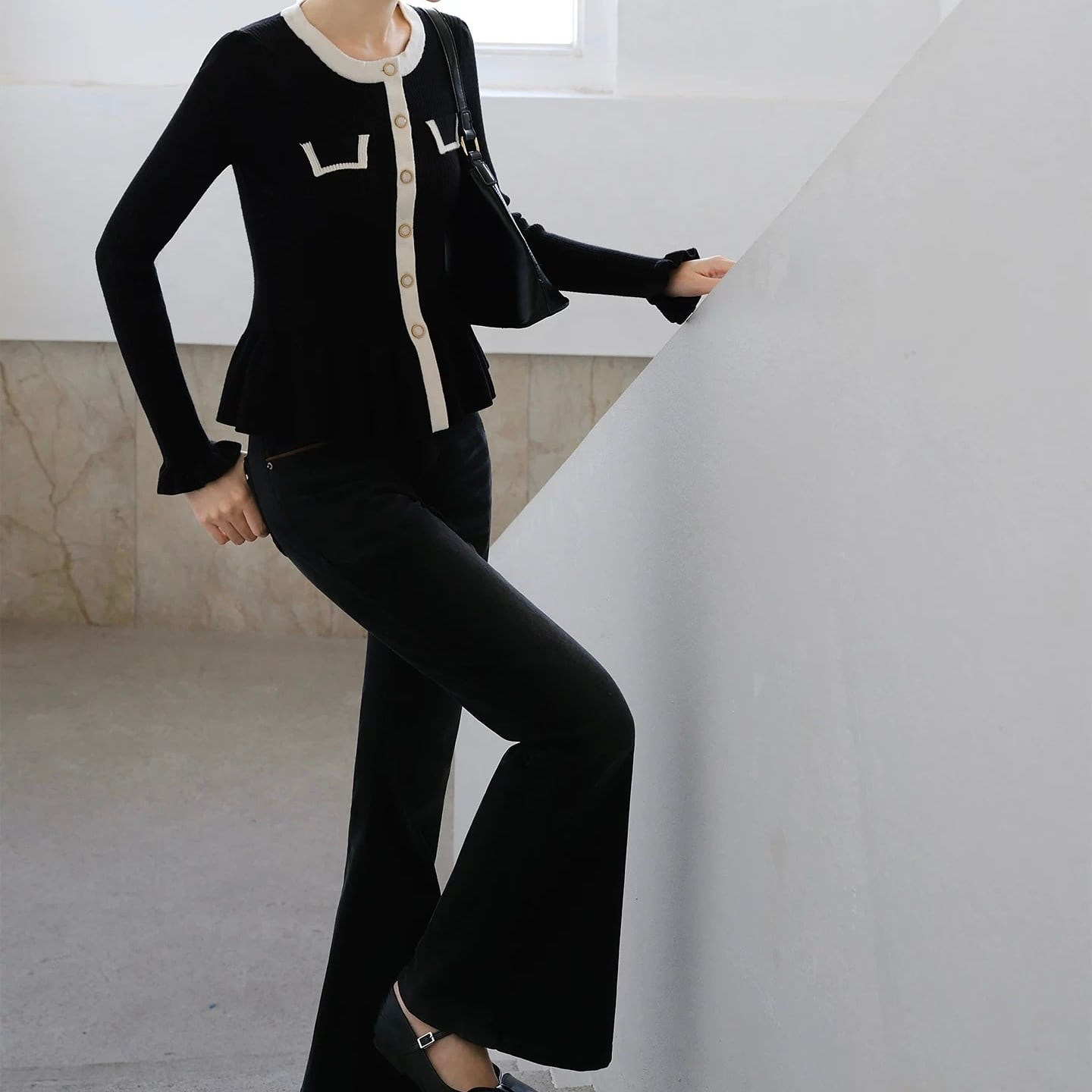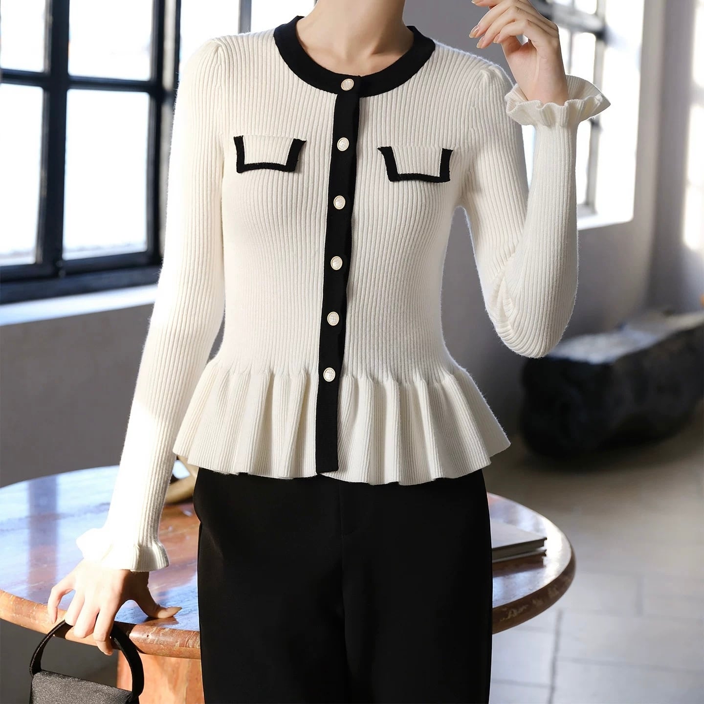 バイカラーラインペプラムニットトップス