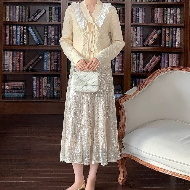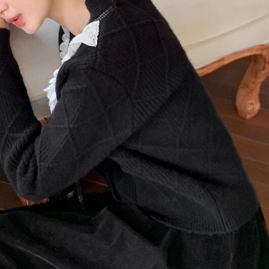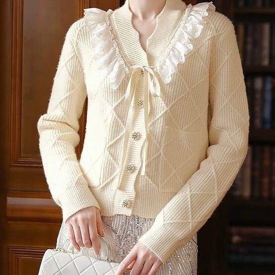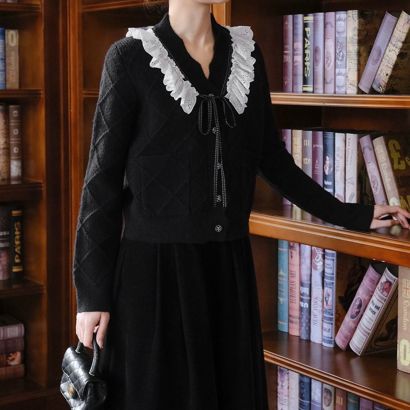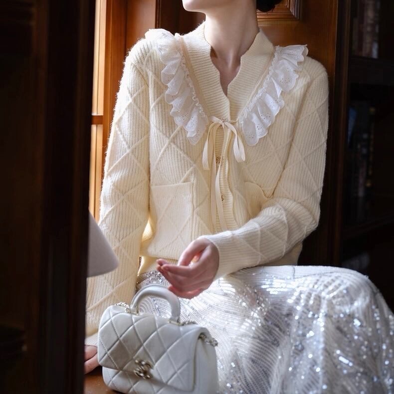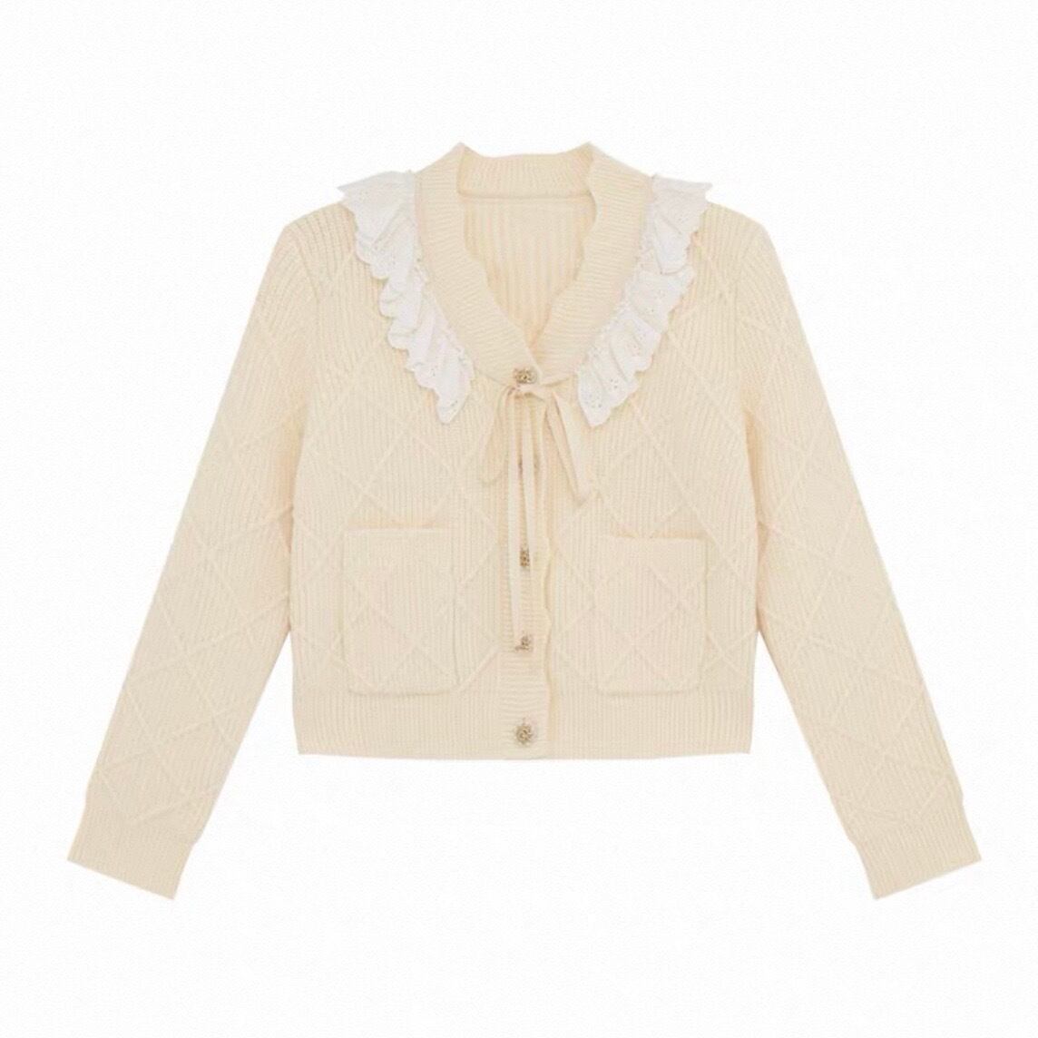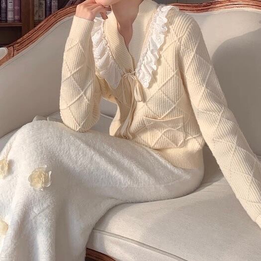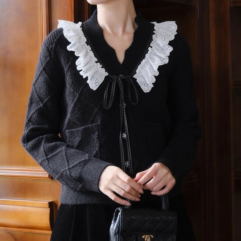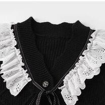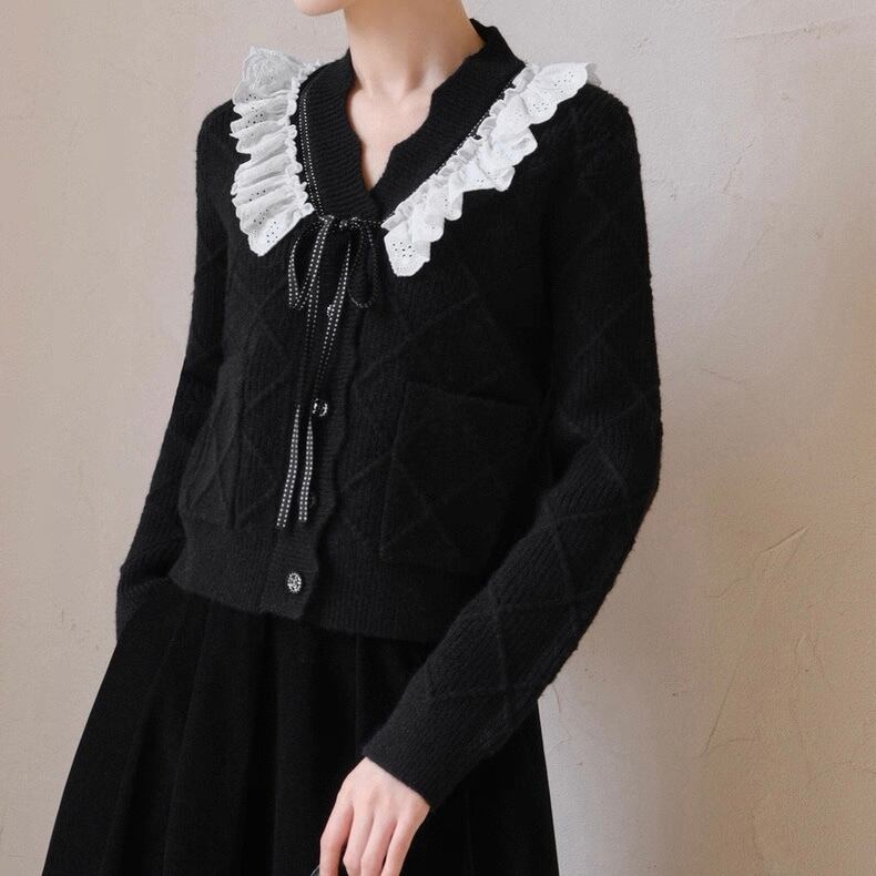 【Blackのみ】レースフリルリボンニットカーディガン