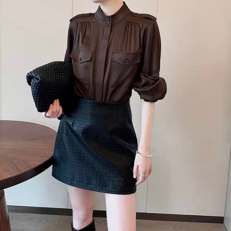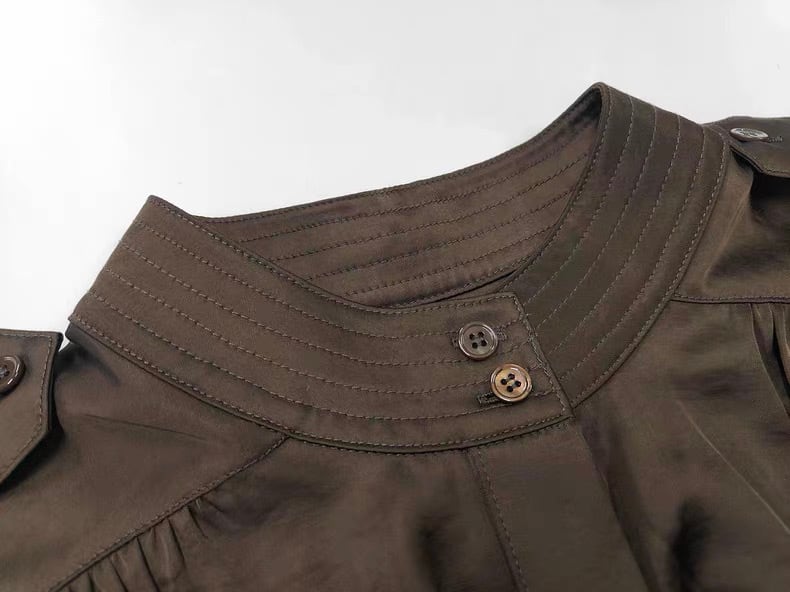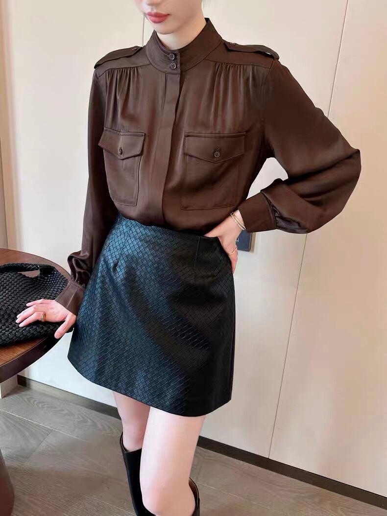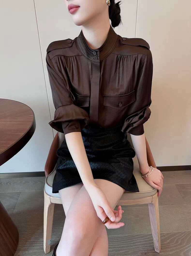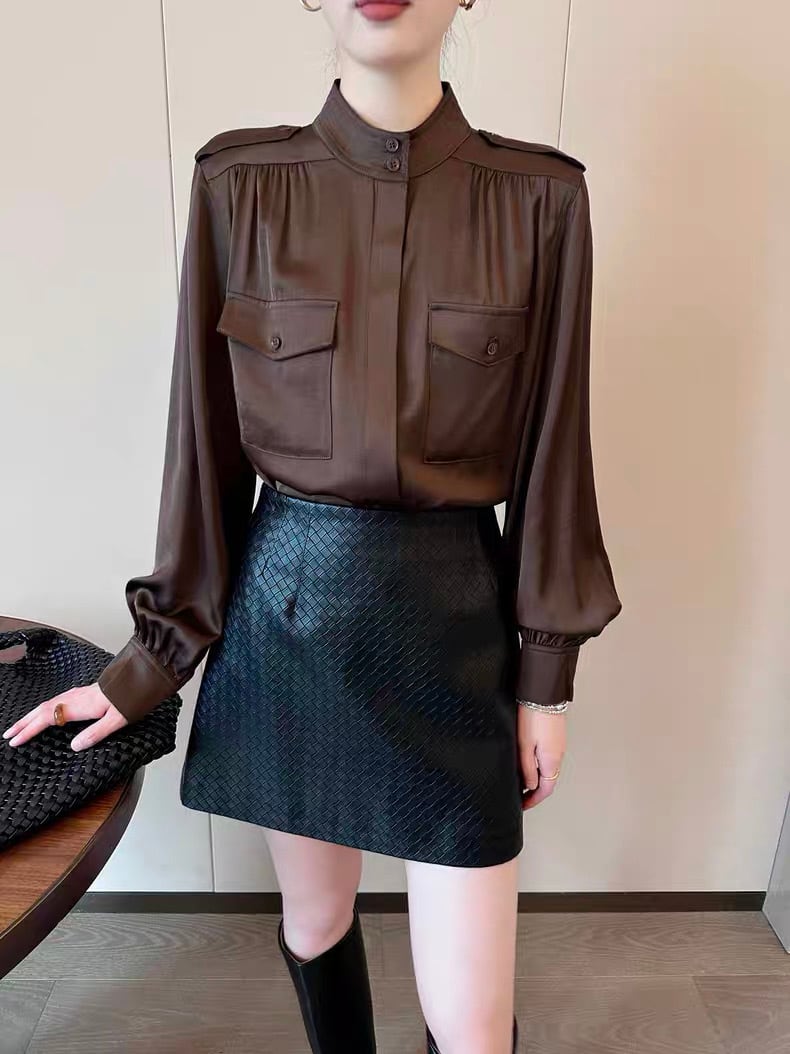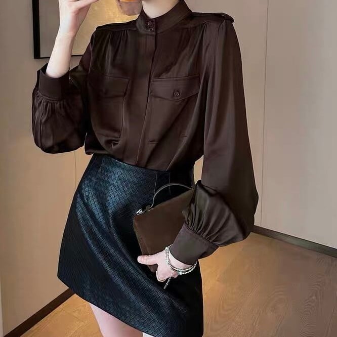 スタンドカラーバルーンスリーブブラウンブラウス