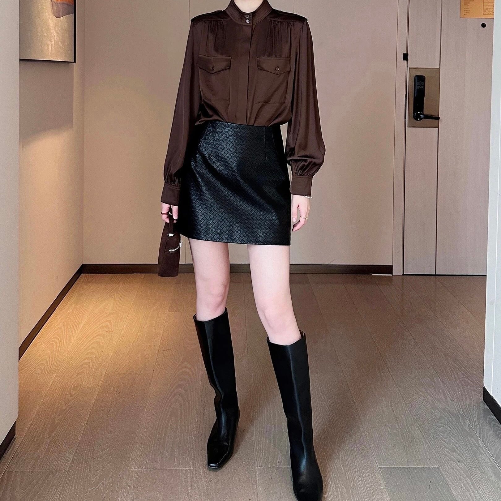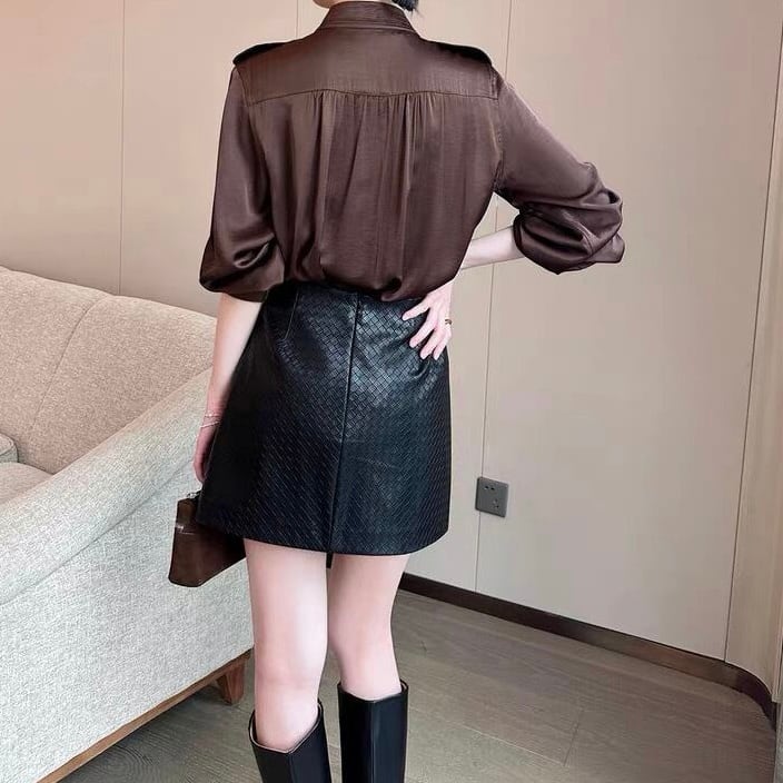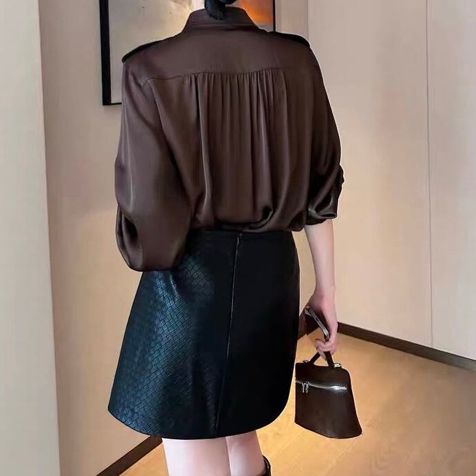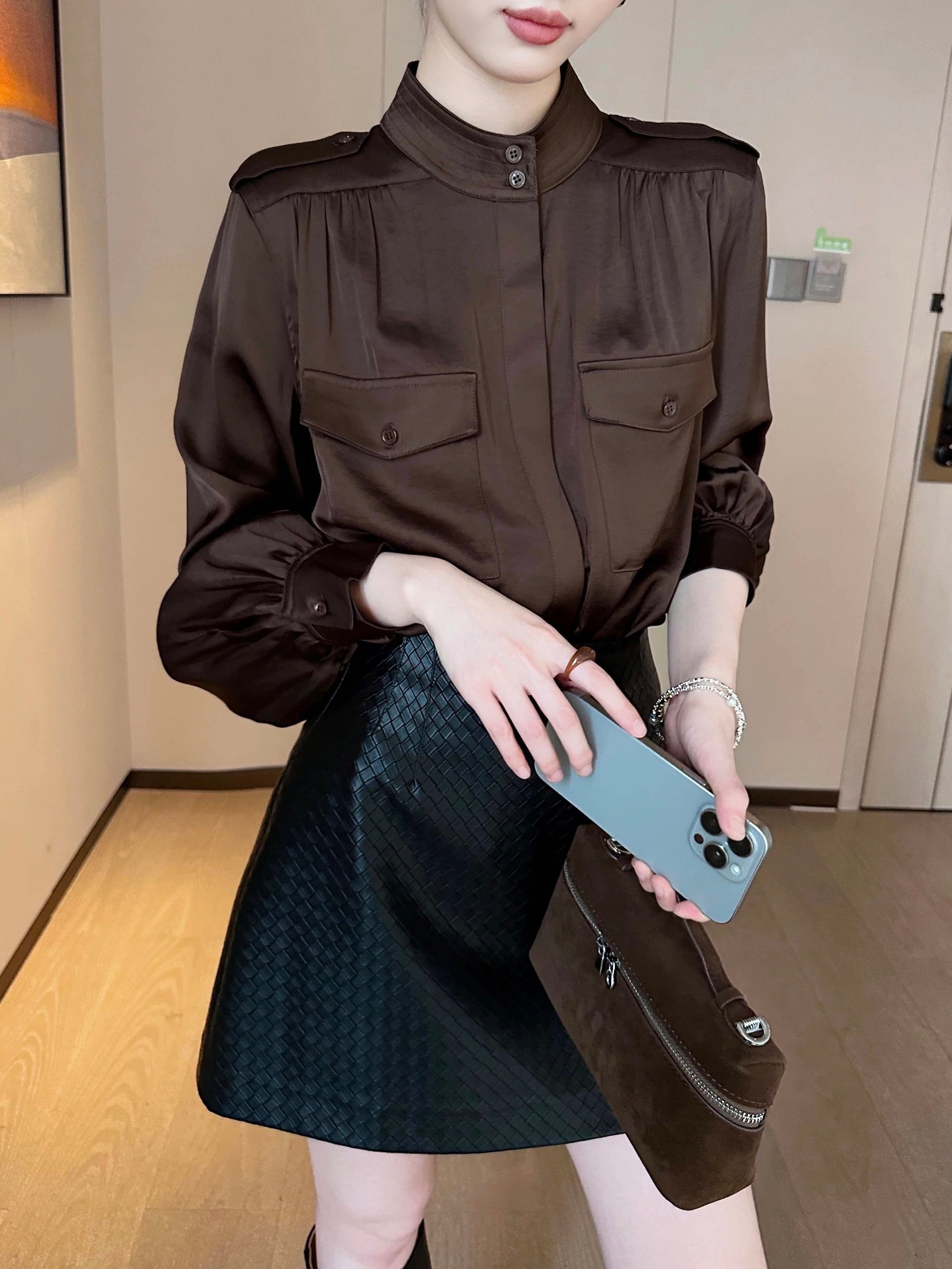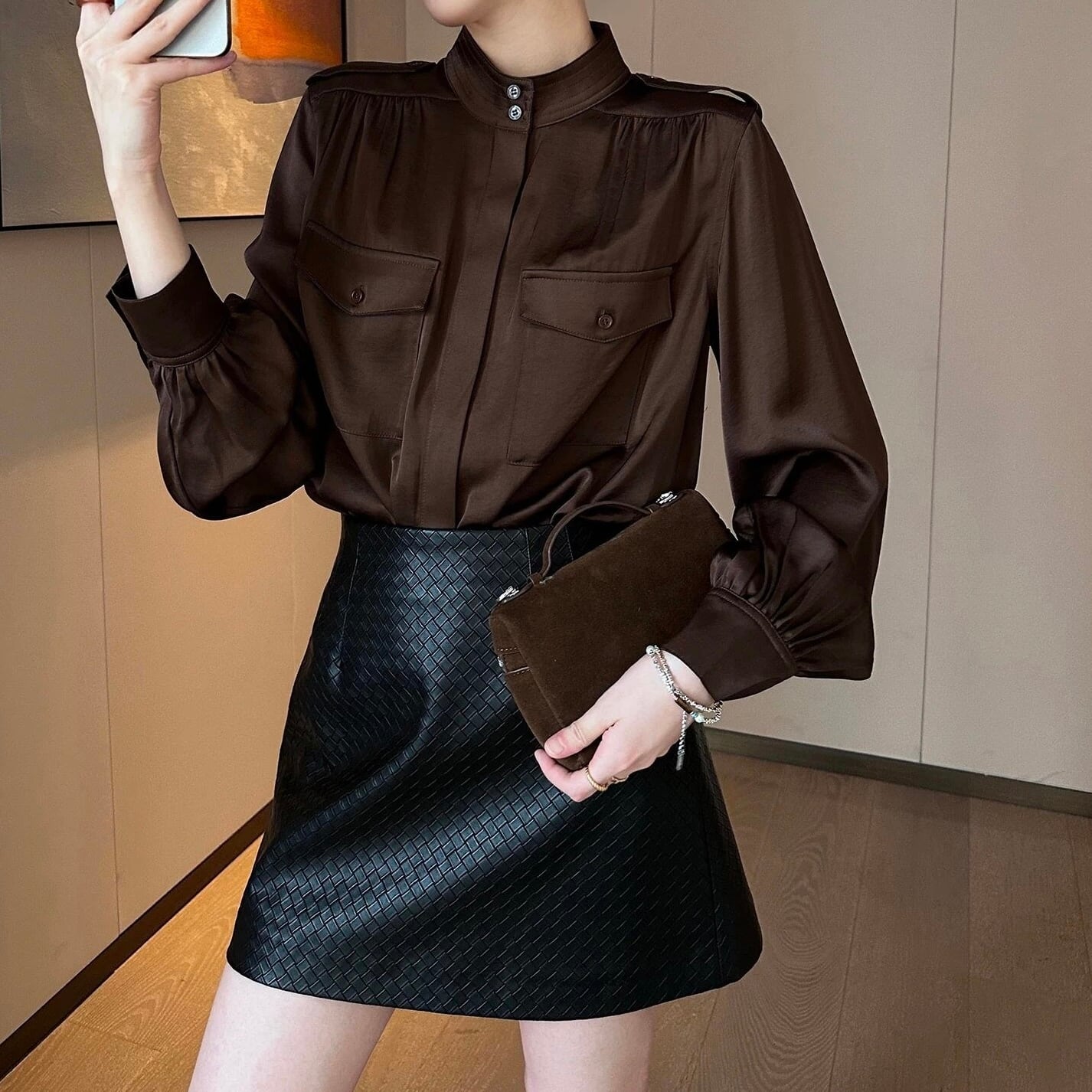 スタンドカラーバルーンスリーブブラウンブラウス