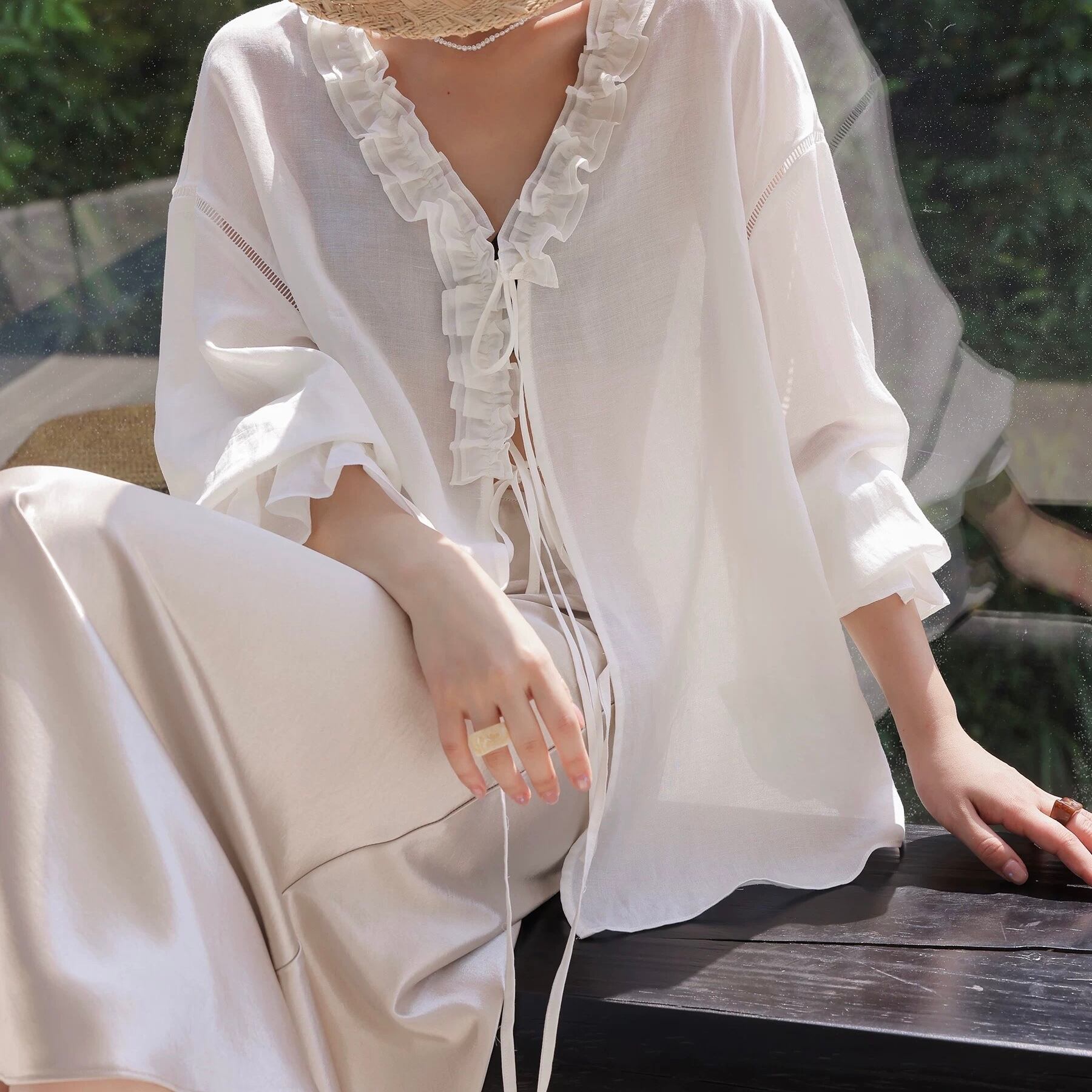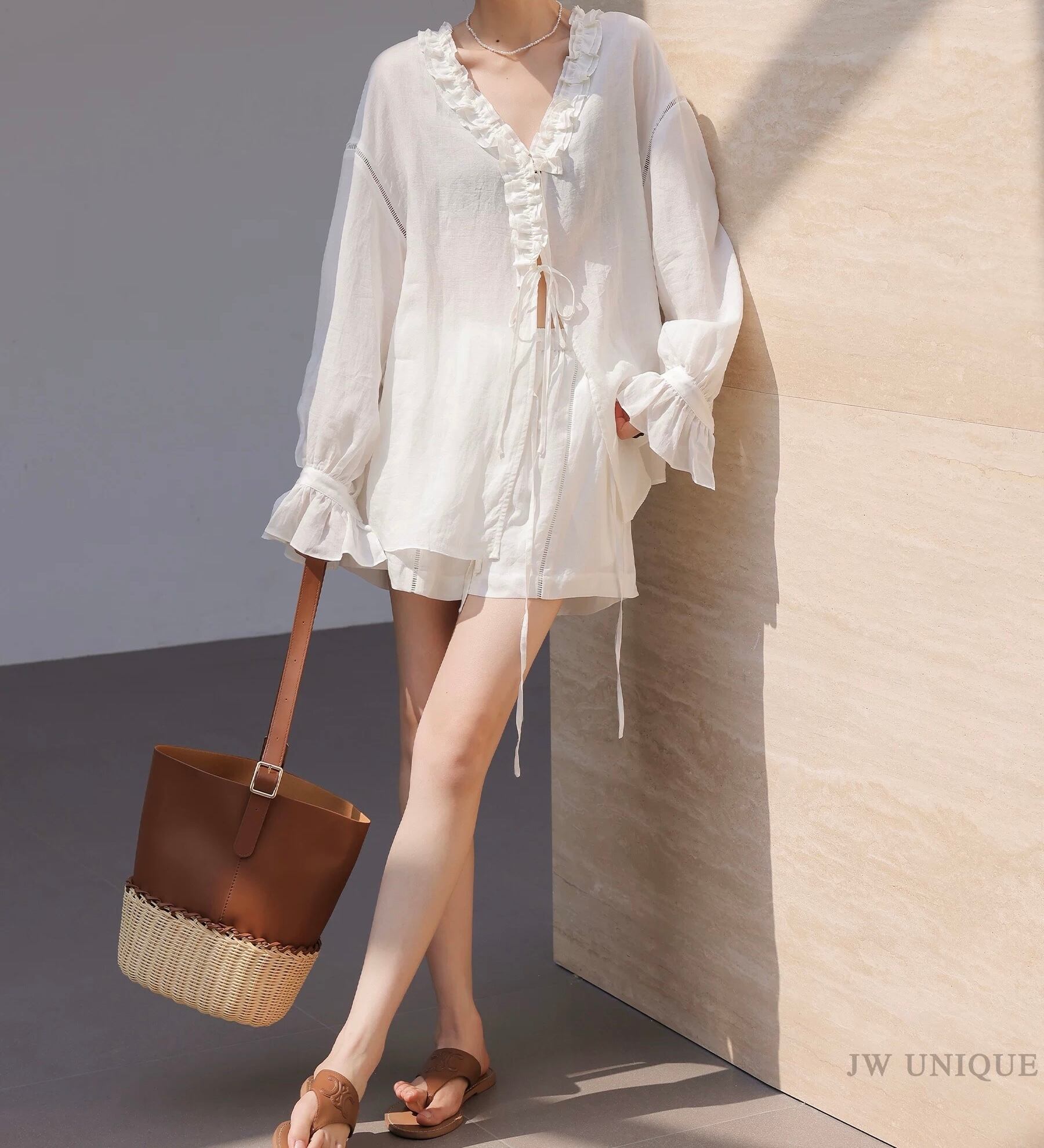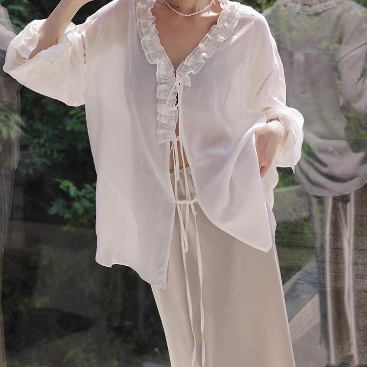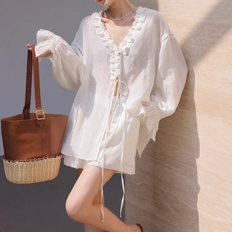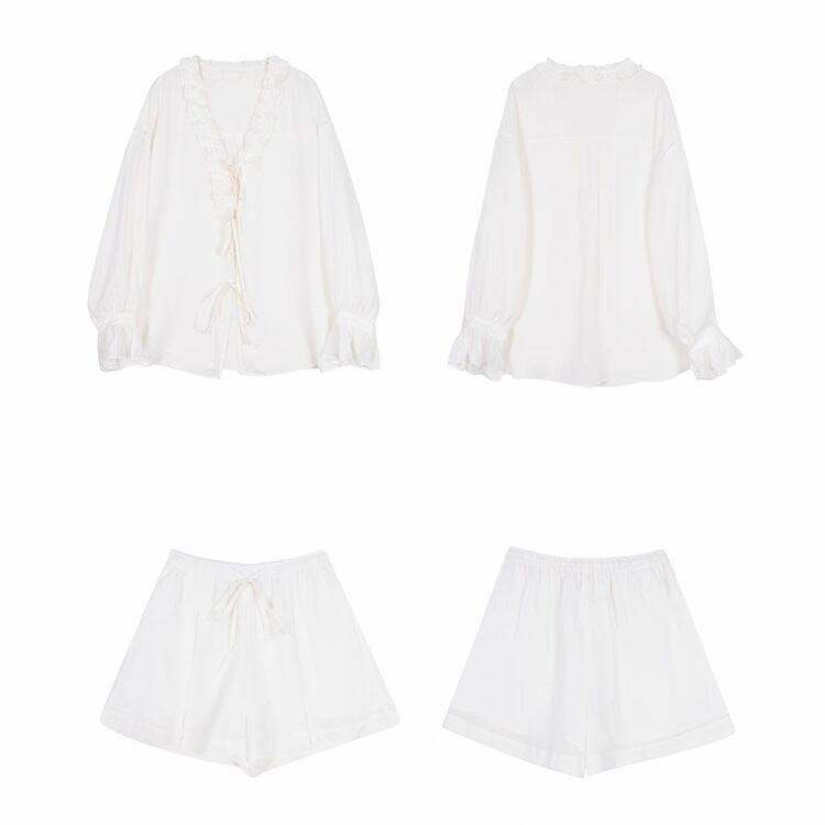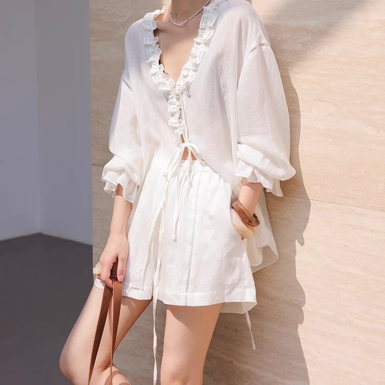 【上下別売り可】Vネックフリルブラウス&ショートパンツセットアップ