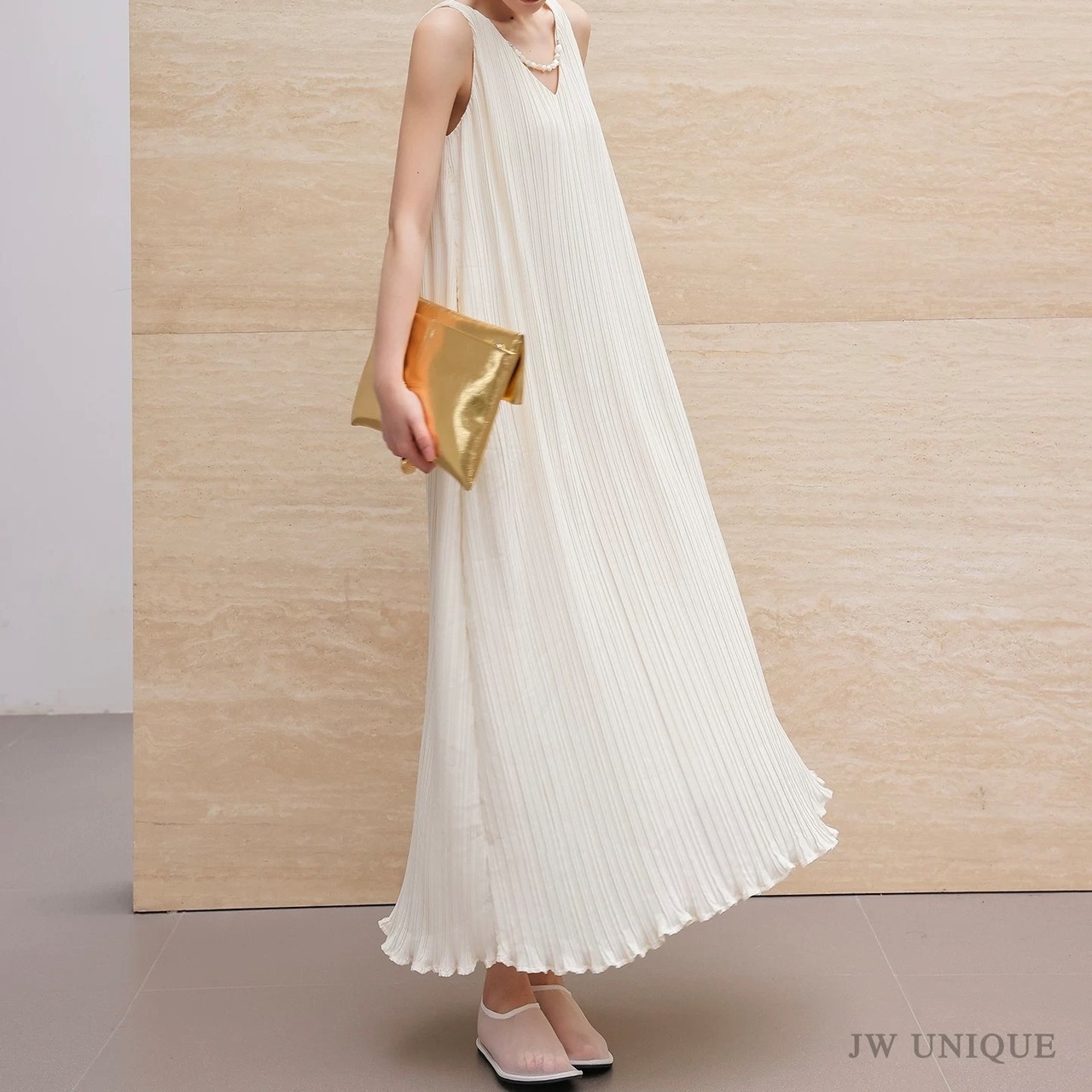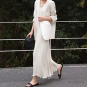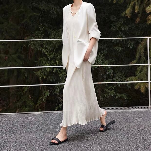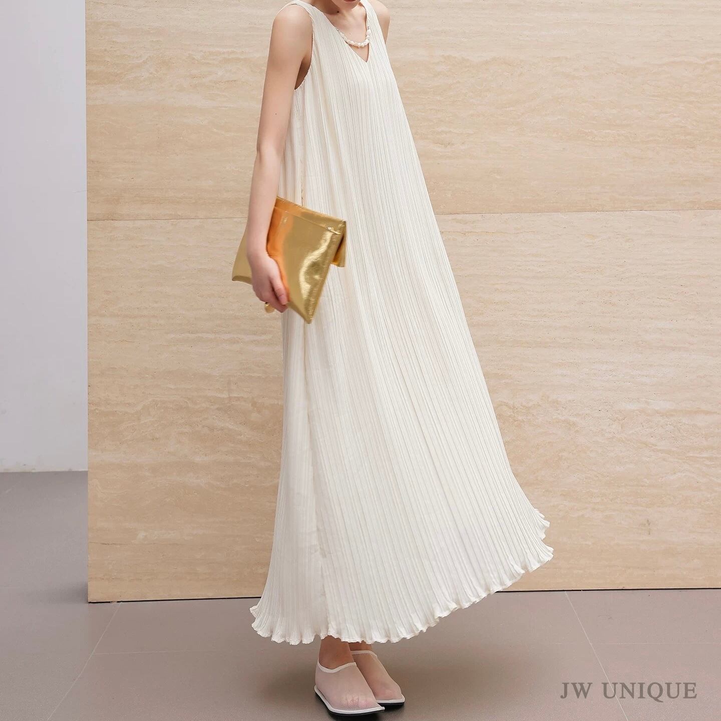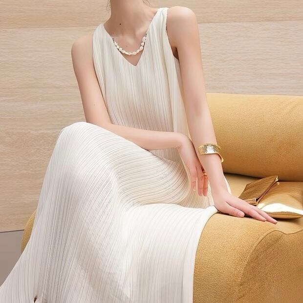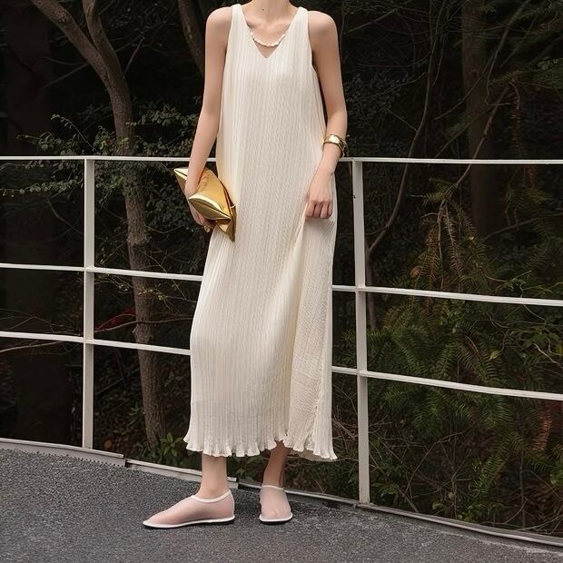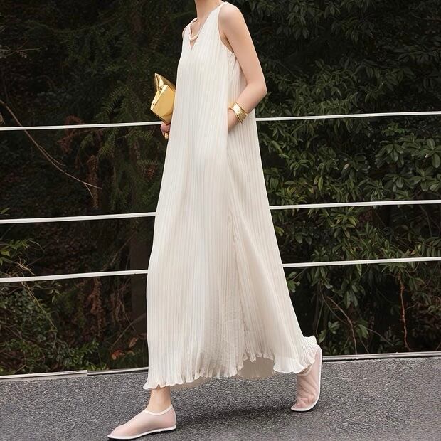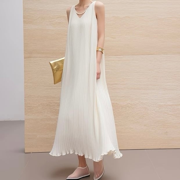 Vネックノースリーブロング裾フリルワンピース