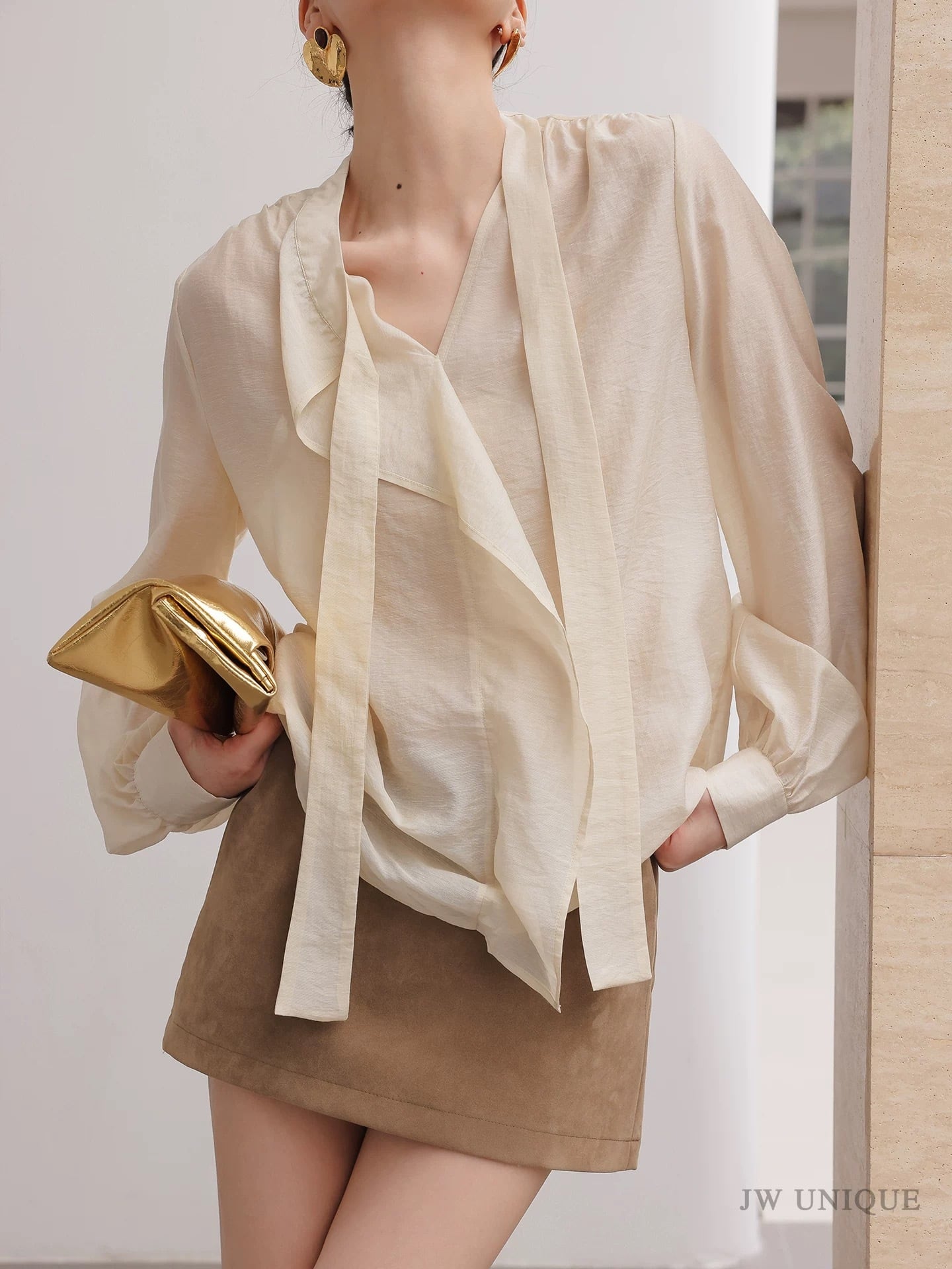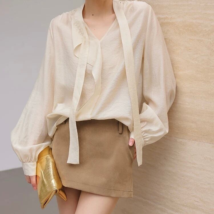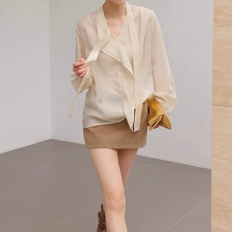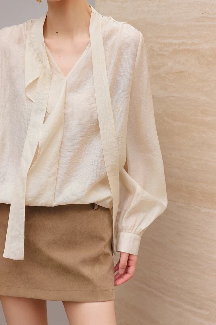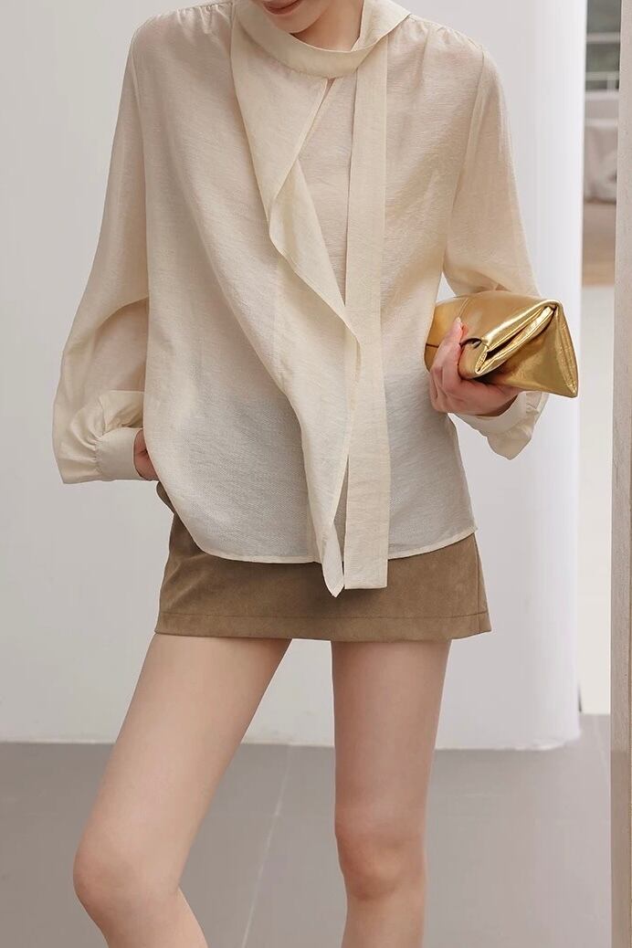 ボウタイシンプルフリルクリームブラウス