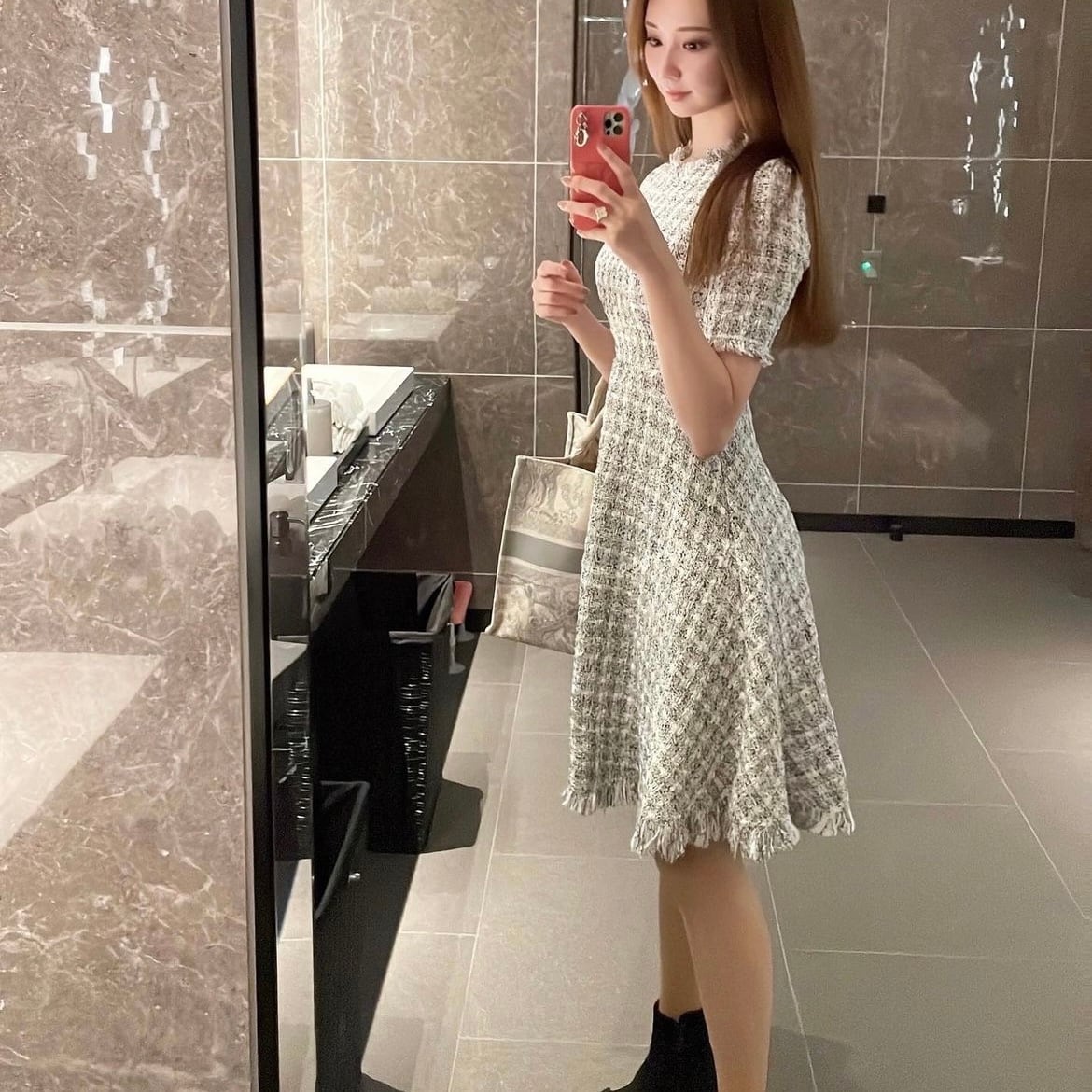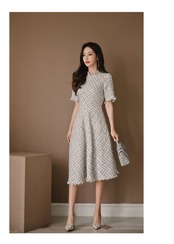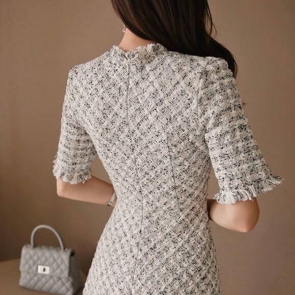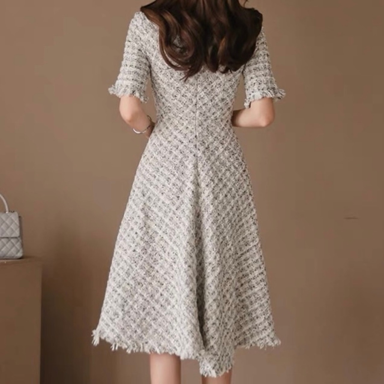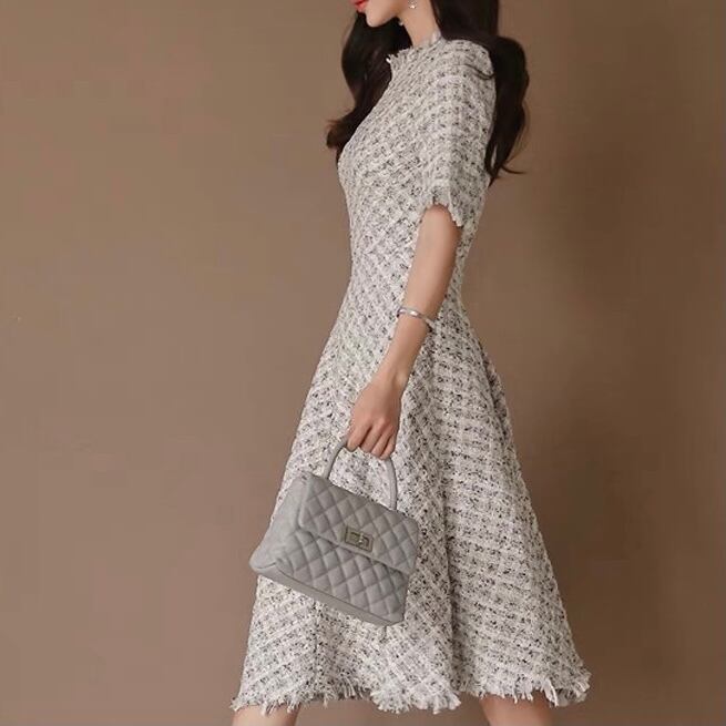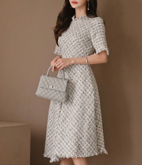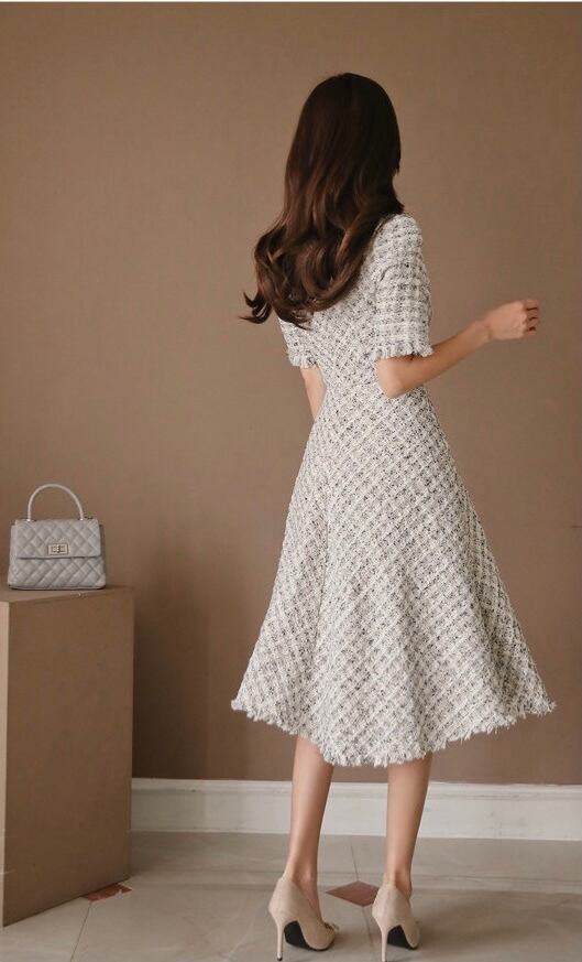ツイード ミディ丈 フリンジ フレア ワンピース