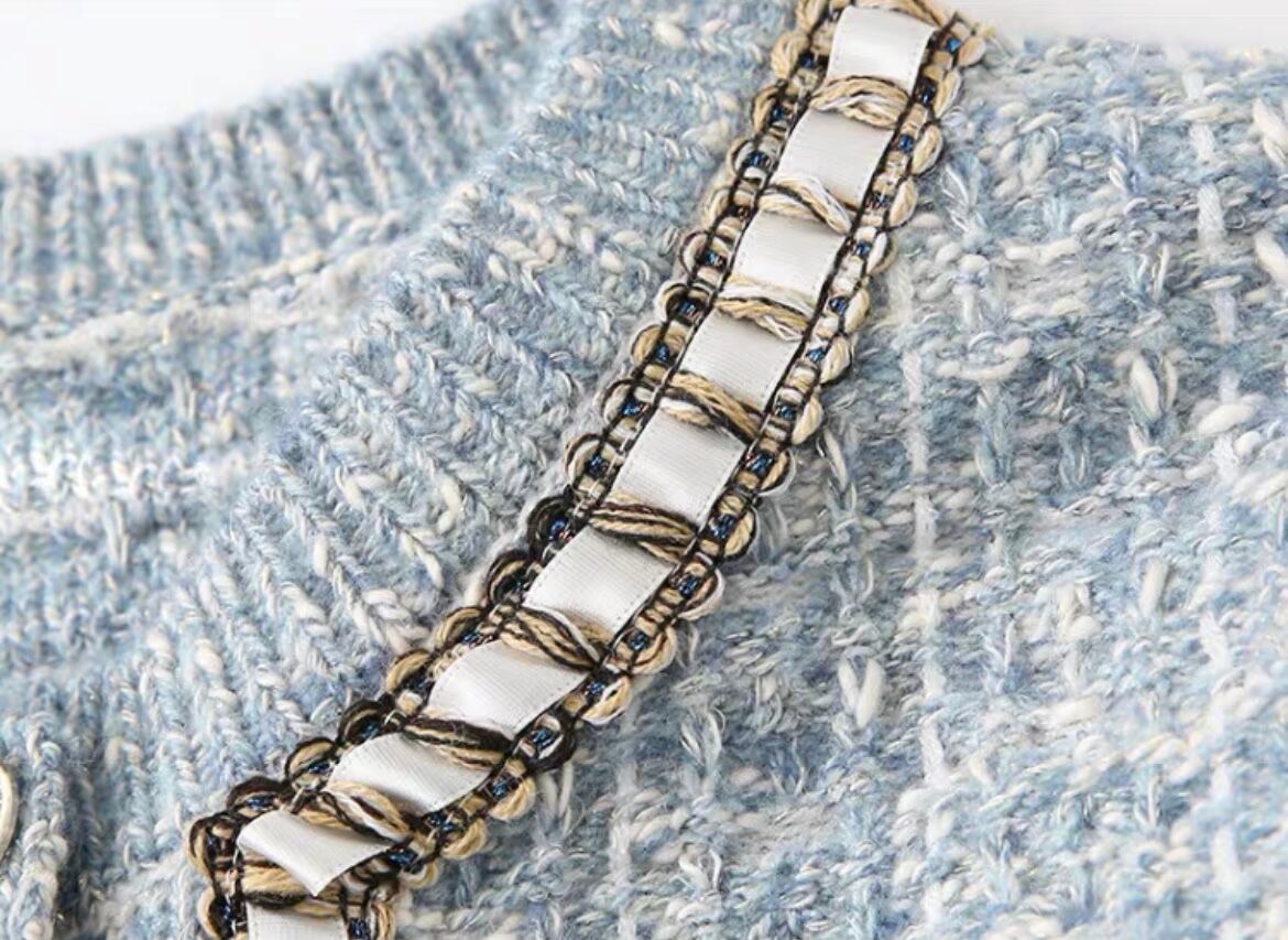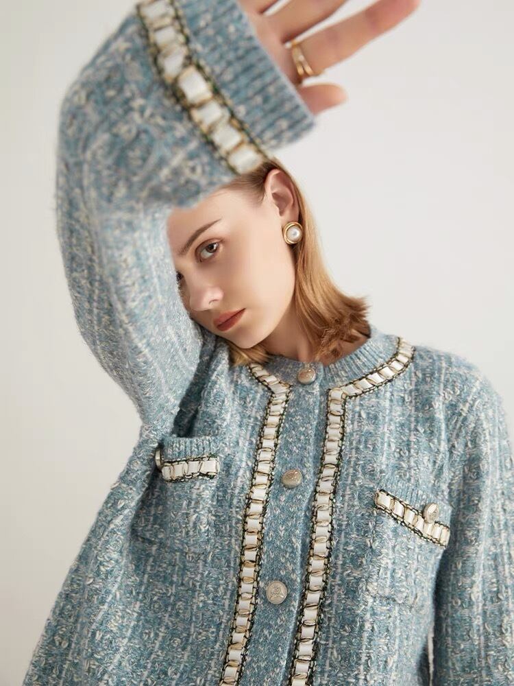 華やかなブルーのツイードがパッと目を惹くカーディガン。