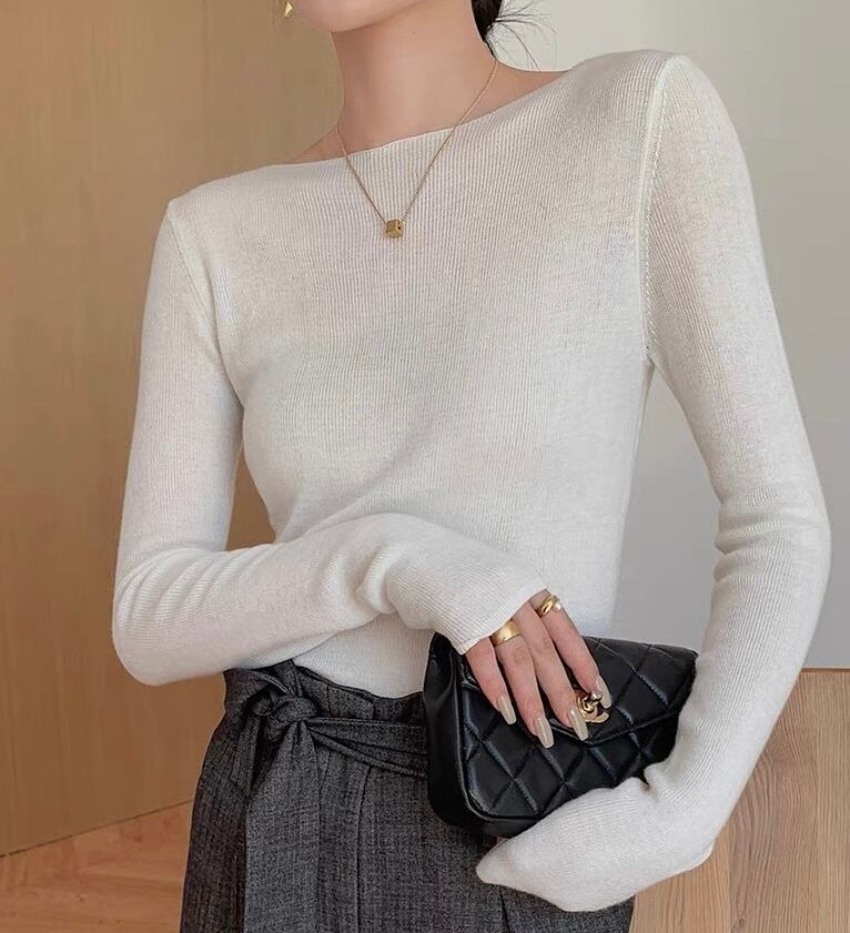 フェミニンなボートネックのニットトップス。