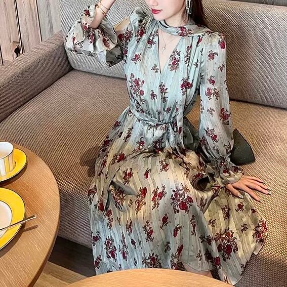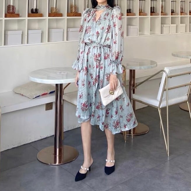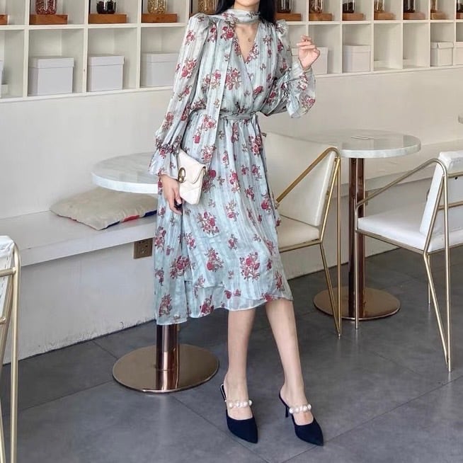花柄×カシュクール×ウエストフィット×フレアーで女性らしさ満載のワンピース。