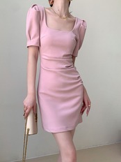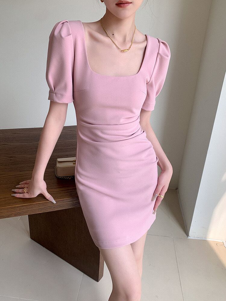 【M完売】ウエストタック パフスリーブ スクエアネック ピンク タイトワンピース