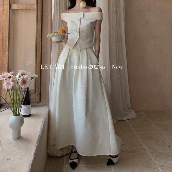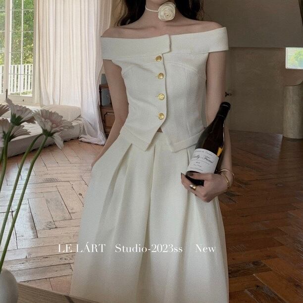 クラシカル ワッフル オフショルダ フレアスカート セットアップ