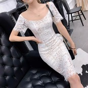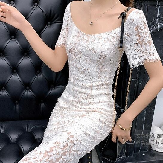 ボートネックレースタイトスリットワンピース
