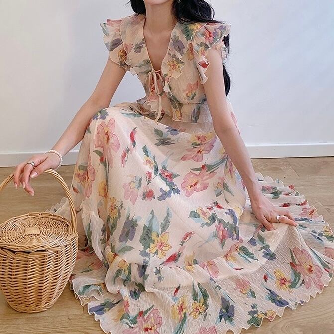 ロマンティックフリルフラワーロングワンピース(半袖/長袖)
