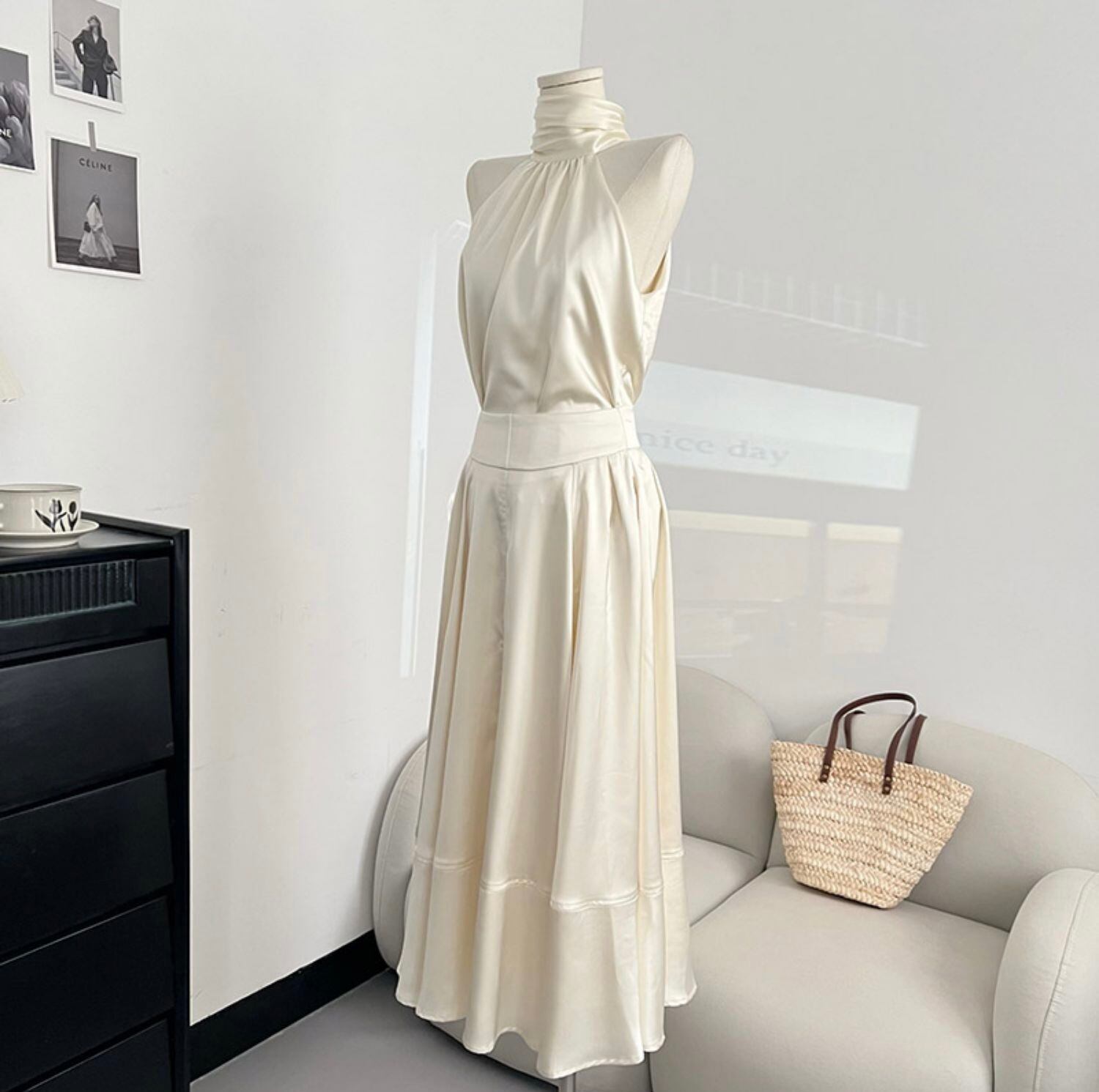 ホルターネック ロング サテン セットアップ