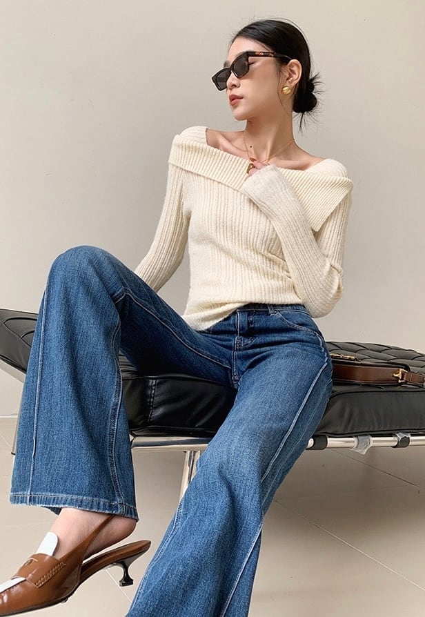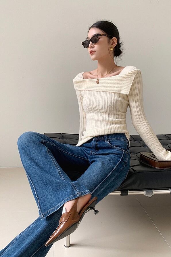 変形スクエアネックリブニットトップス