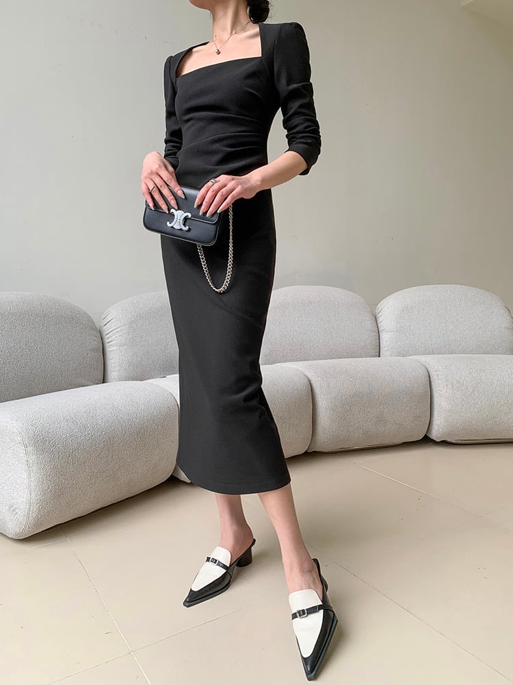 スクエアネックウエストタックタイトスリムワンピース