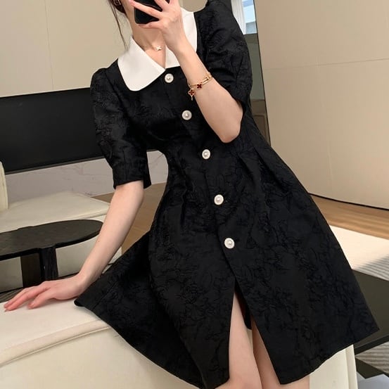 フレンチ襟ブラックジャガードフレアミニワンピース
