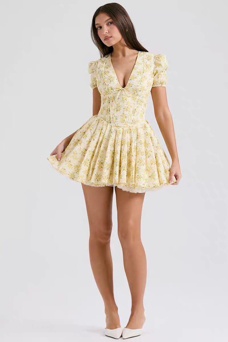 Vネックイエローフラワーフレアミニワンピース