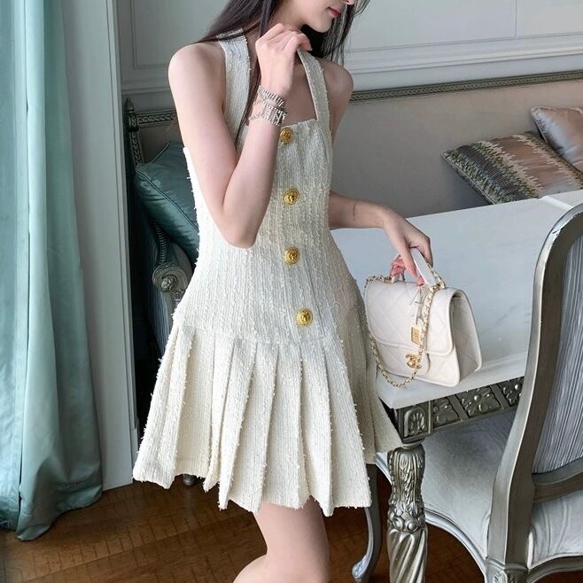 ツイードプリーツミニノースリーブワンピース
