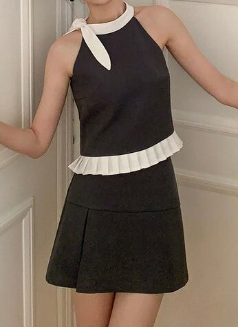 サイドリボンホルターネックバイカラーミニスカートセットアップ