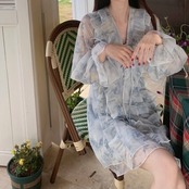 Vネックリボンブルーフラワーラッフルワンピース