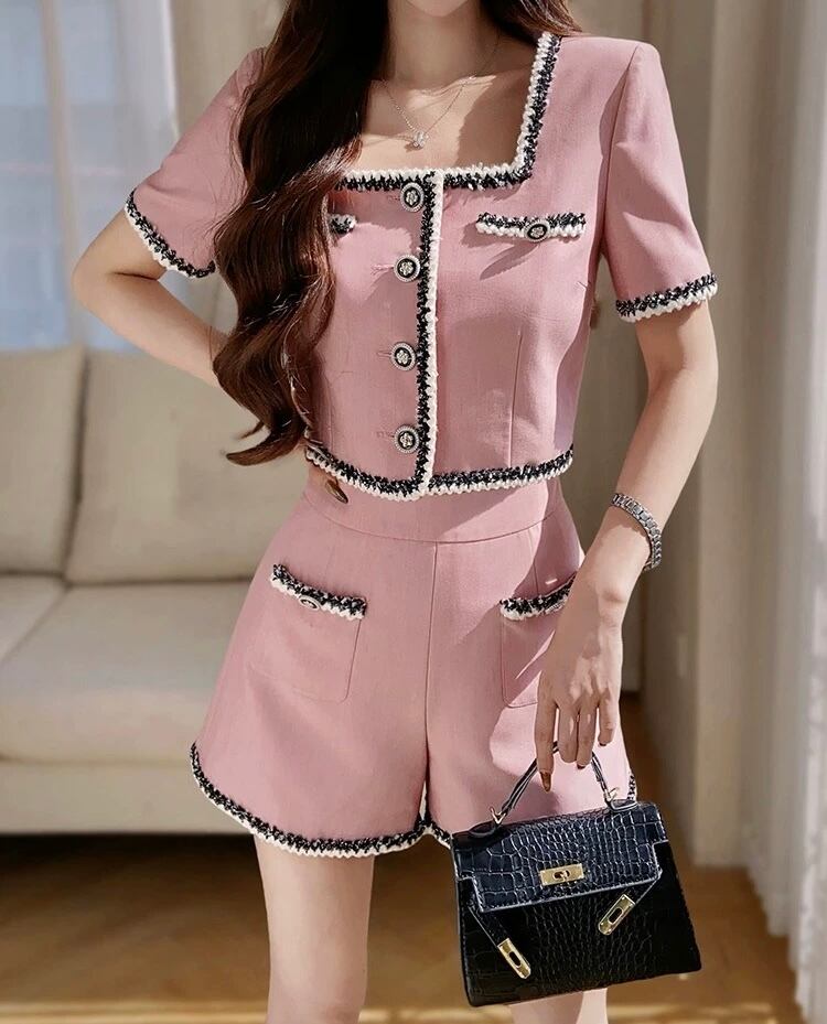 スクエアネックピンクショートパンツセットアップ