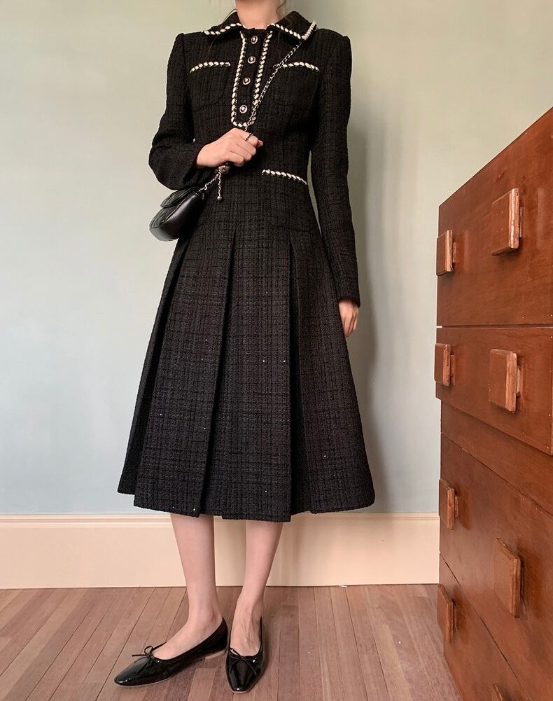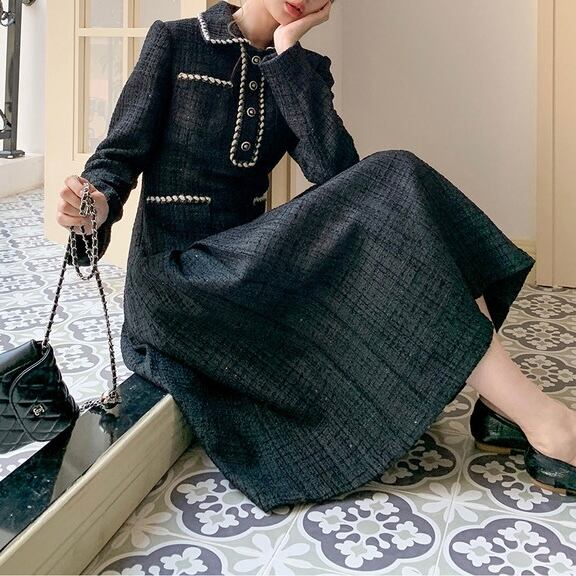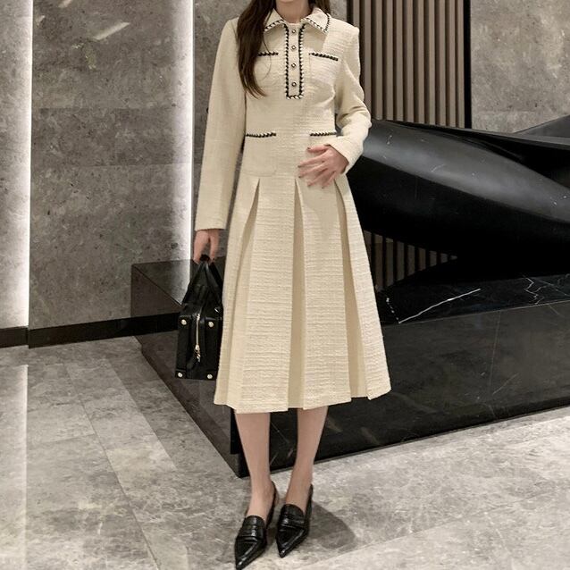 襟バイカラーラインボックスプリーツフレンチワンピース