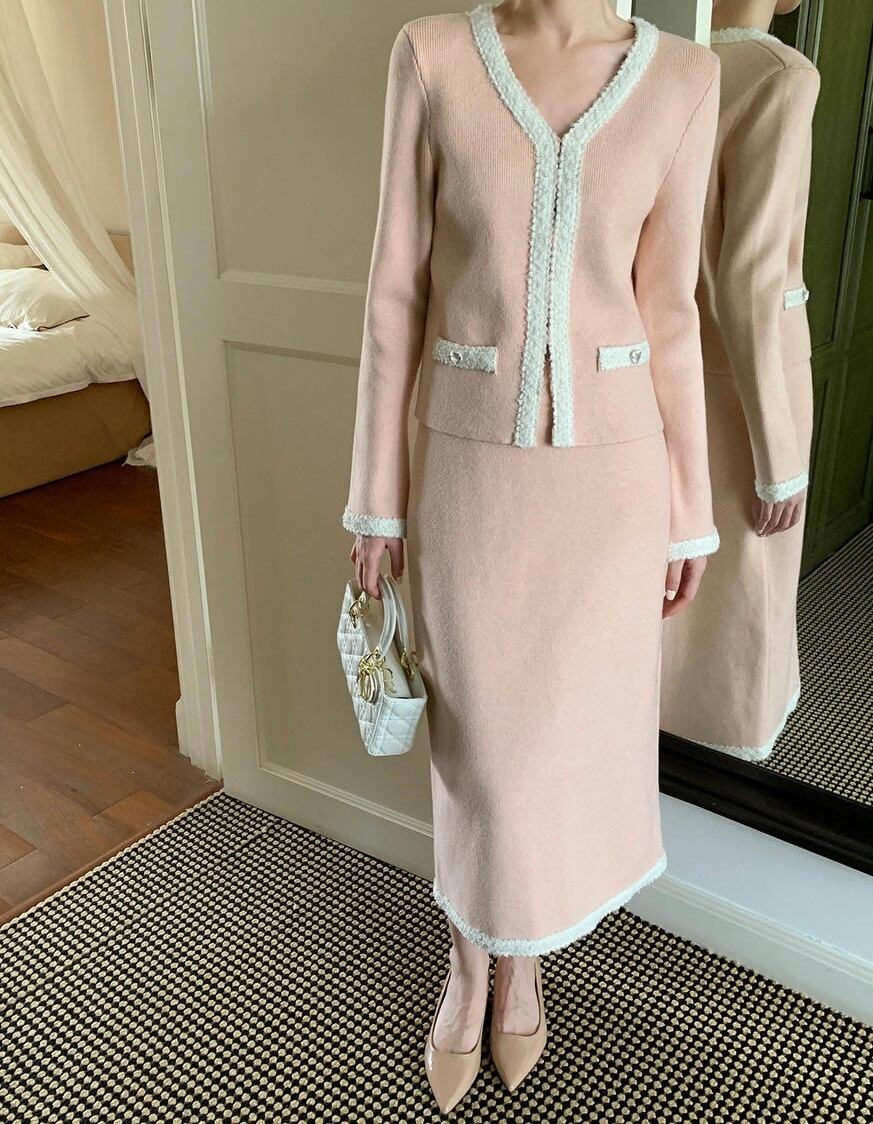 フレンチピンクVネックジャケットスカートセットアップ
