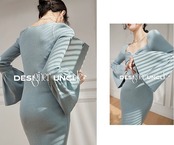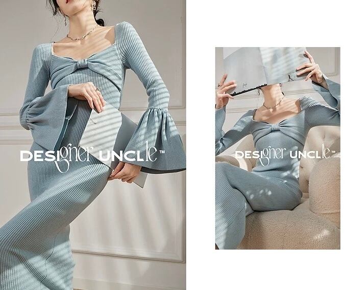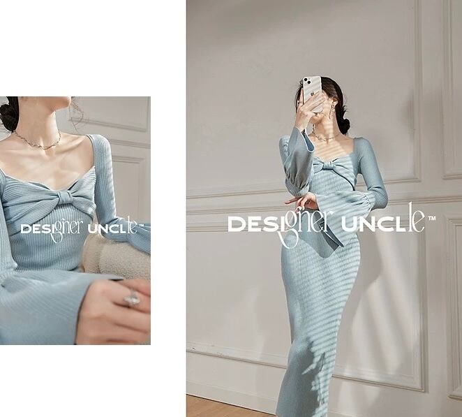 ベルスリーブリボンタイトリブニットブルーワンピース