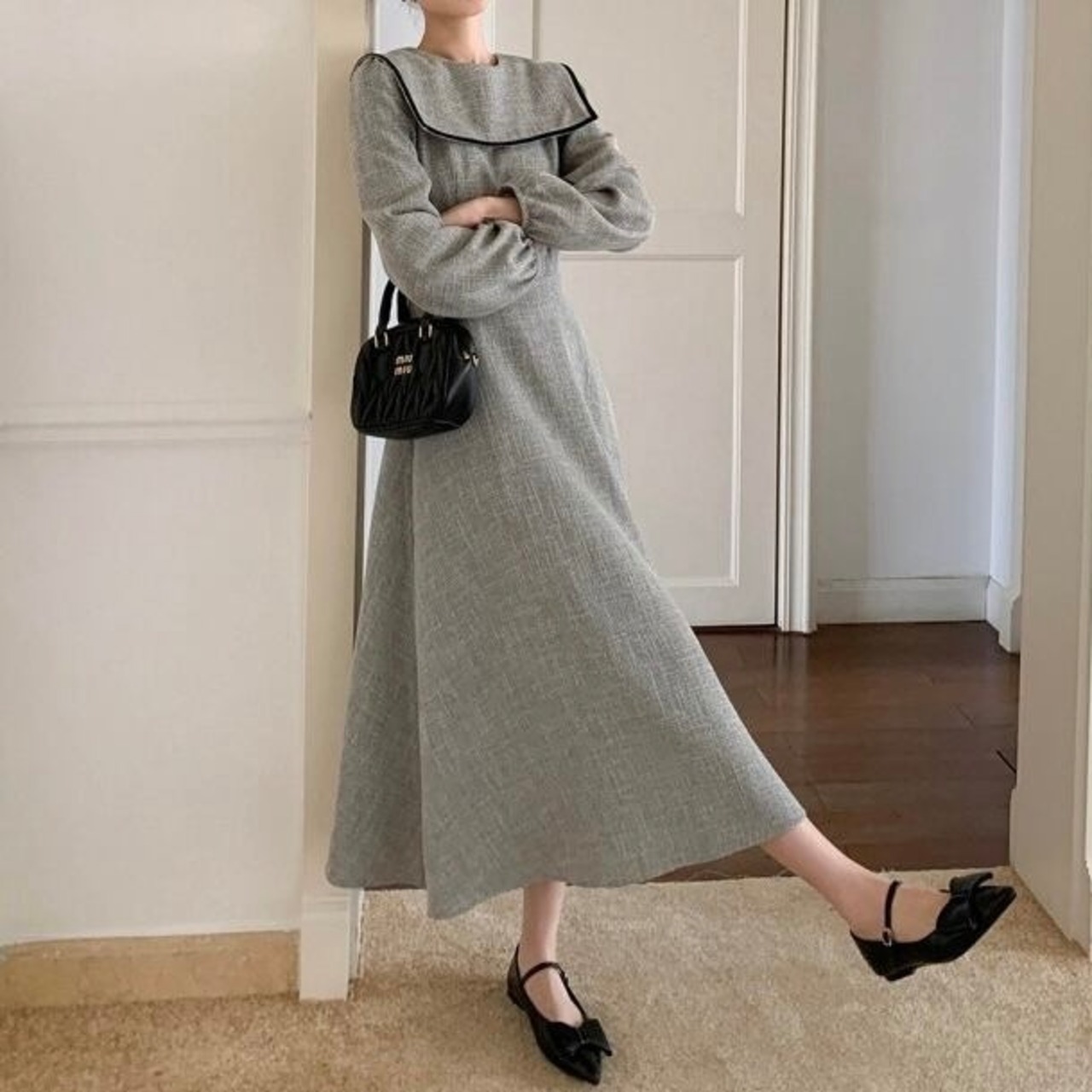 スクエアカラーフレアロングワンピース