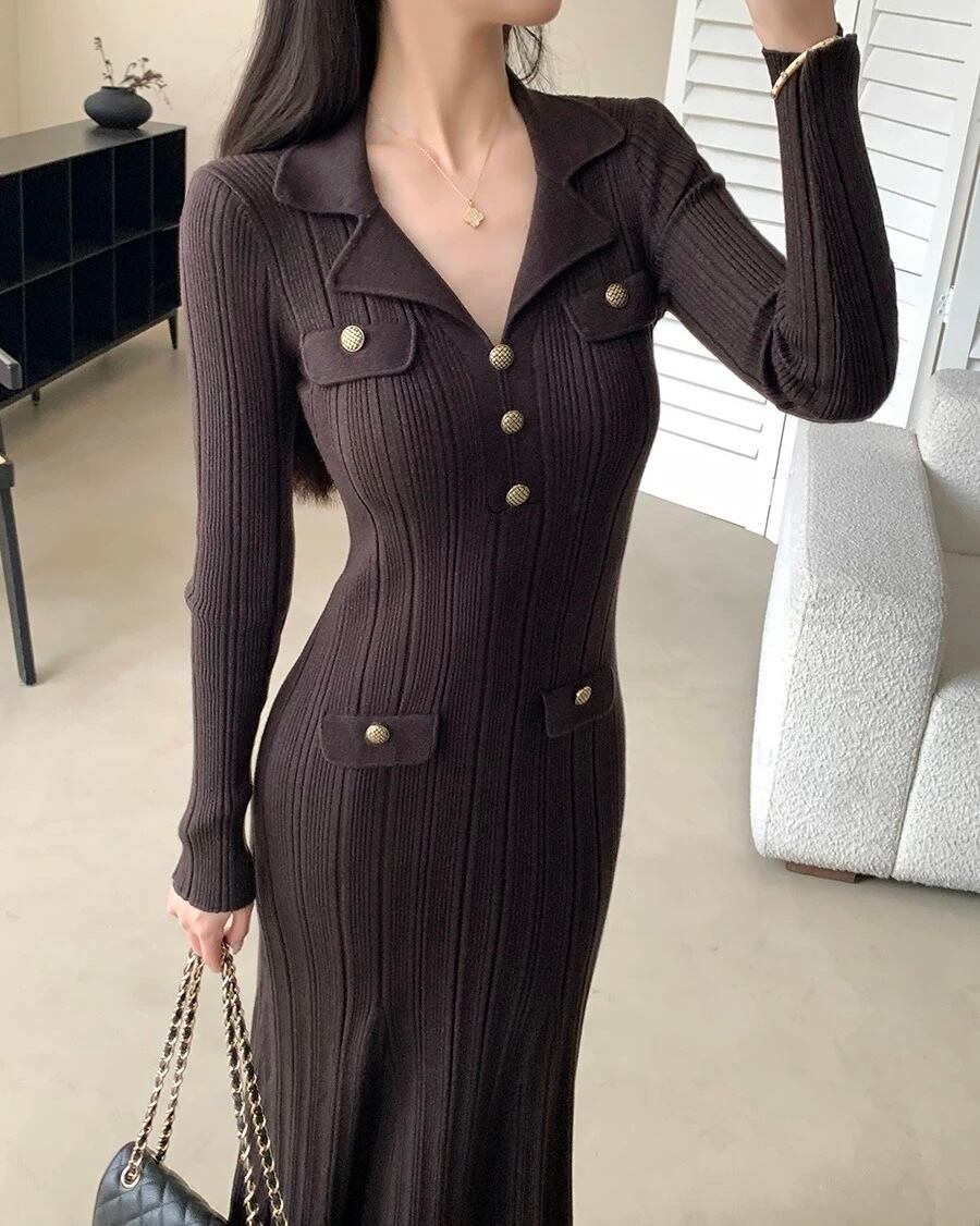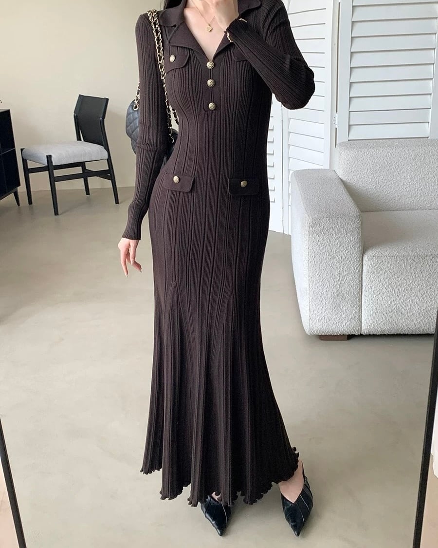 チョコレートブラウンテーラード襟ニットロングワンピース