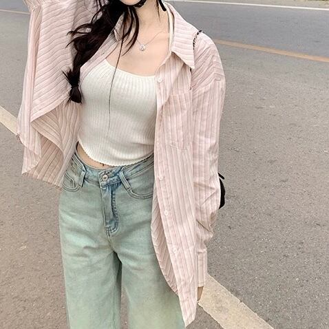 【Lのみ】ピンクストライプシャツブラウスパンツセットアップ